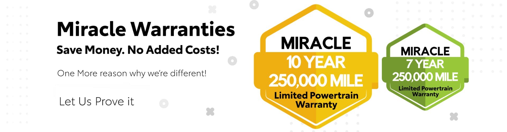 All vehicles that include our pre-owned warranty are clearly labeled on our websites and lots with the warranty indicator badge. To become Miracle Certified, vehicles must pass a rigorous inspection which ensures that you’ll be satisfied with your purchase. These criteria are outlined below.