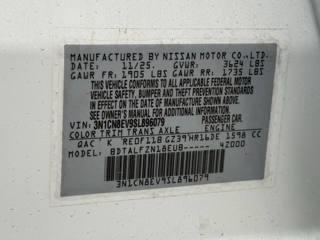 Trunk Package (Shopping Bag Hooks and Trunk Net), 16" Aluminum Alloy Wheels, 4 Speakers, ABS brakes, Air Conditioning, Alloy wheels, Apple CarPlay/Android Auto, Auto High-beam Headlights, Blind Spot Warning, Brake assist, Bumpers: body-color, Carpeted Floor Mats & Trunk Mat (5-Piece Set), Delay-off headlights, Driver door bin, Driver vanity mirror, Dual front impact airbags, Dual front side impact airbags, Electronic Stability Control, Front anti-roll bar, Front Bucket Seats, Front Center Armrest, Front reading lights, Front wheel independent suspension, Fully automatic headlights, Heated door mirrors, Illuminated entry, Knee airbag, Low tire pressure warning, Occupant sensing airbag, Outside temperature display, Overhead airbag, Panic alarm, Passenger door bin, Passenger vanity mirror, Power door mirrors, Power steering, Power windows, Premium Paint, Radio data system, Radio: AM/FM Audio System, Rear Parking Sensors, Rear side impact airbag, Rear window defroster, Remote keyless entry, Speed control, Splash Guards, Split folding rear seat, Steering wheel mounted audio controls, Tachometer, Telescoping steering wheel, Tilt steering wheel, Traction control, Trip computer, Upgraded Cloth Seat Trim, and Variably intermittent wipers. Price includes: $750 - Nissan MY25 Bonus Cash. Exp. 03/02/2026 Price includes dealer added accessories.