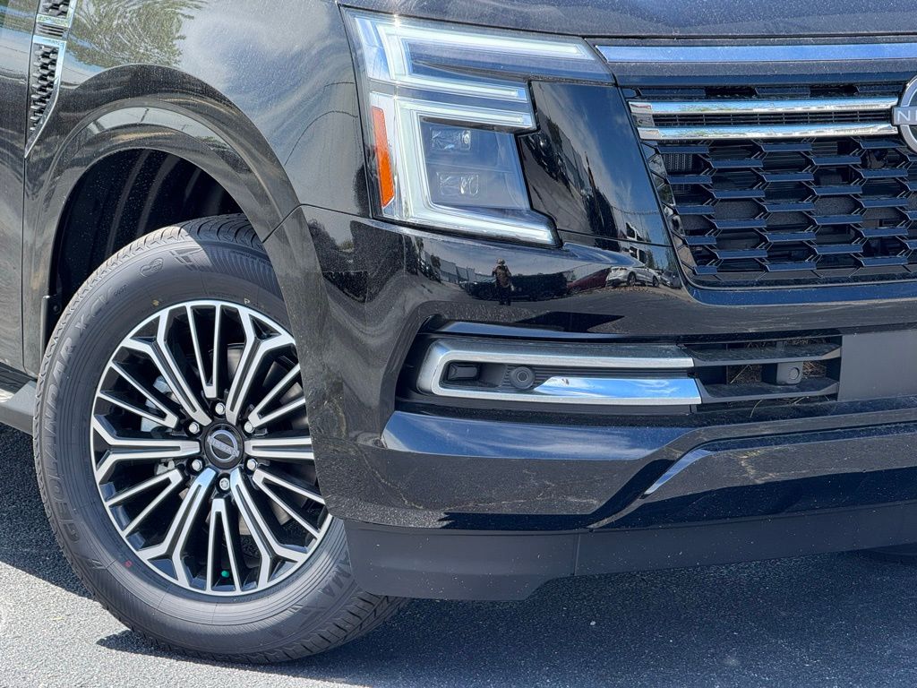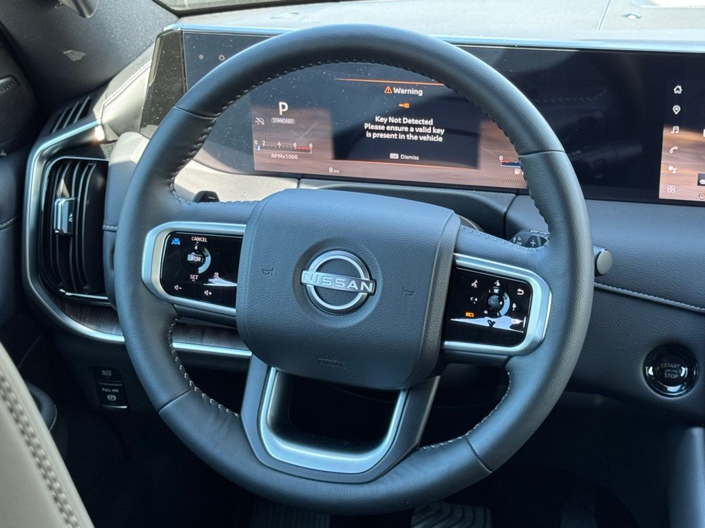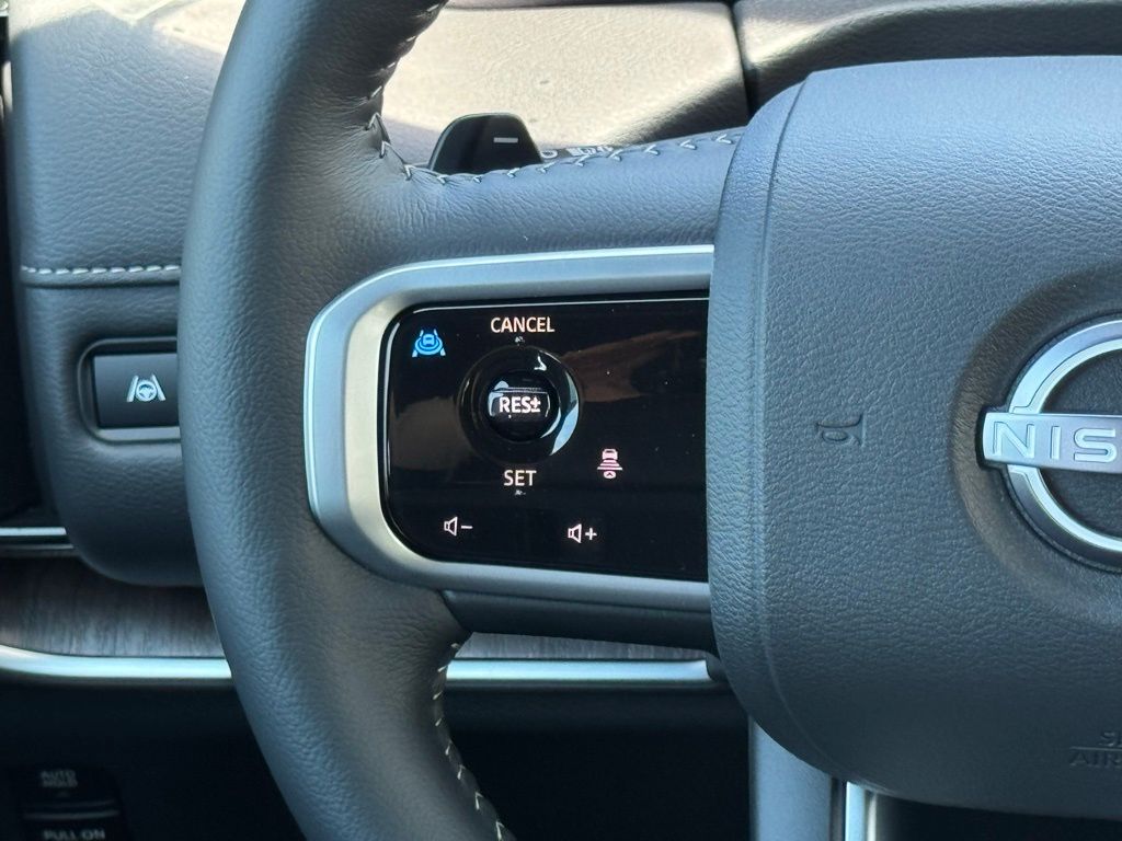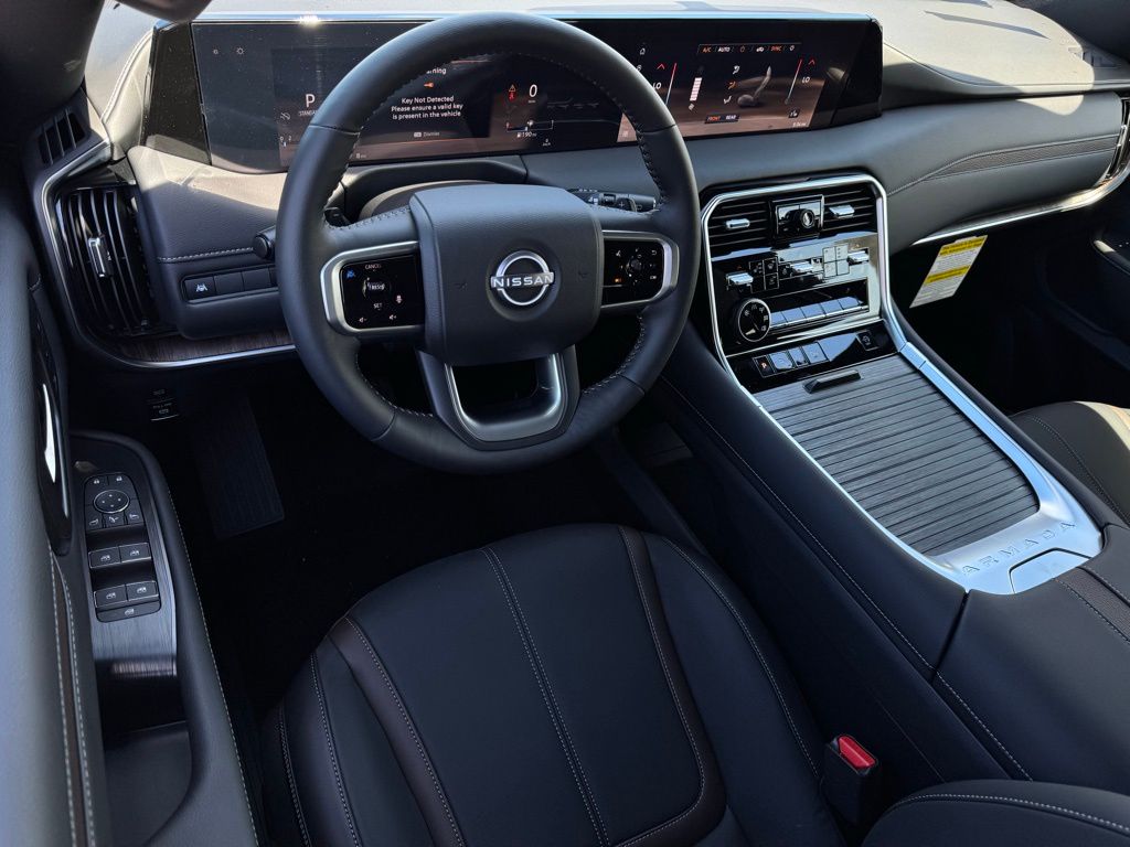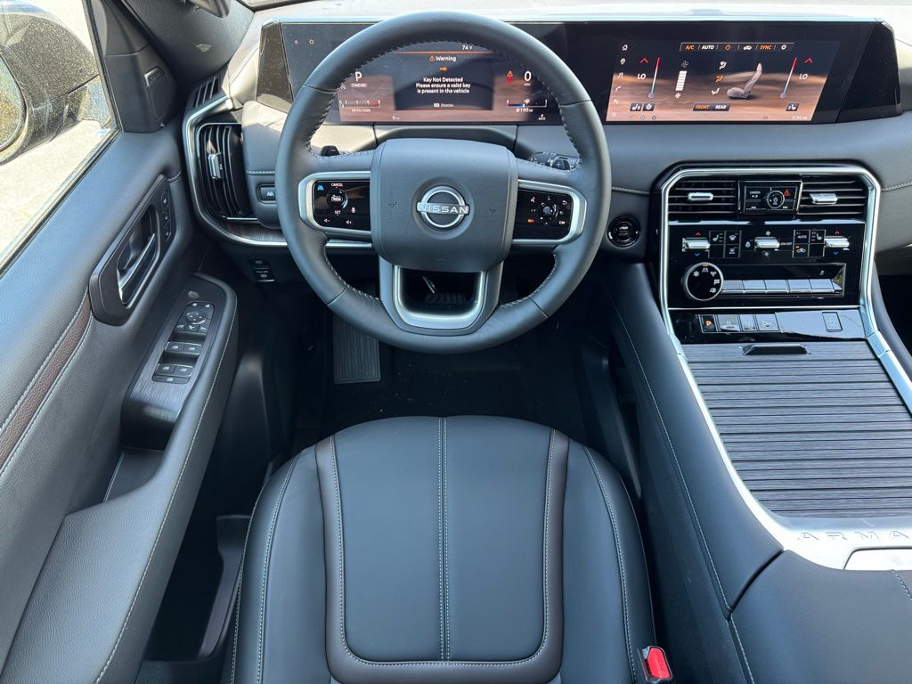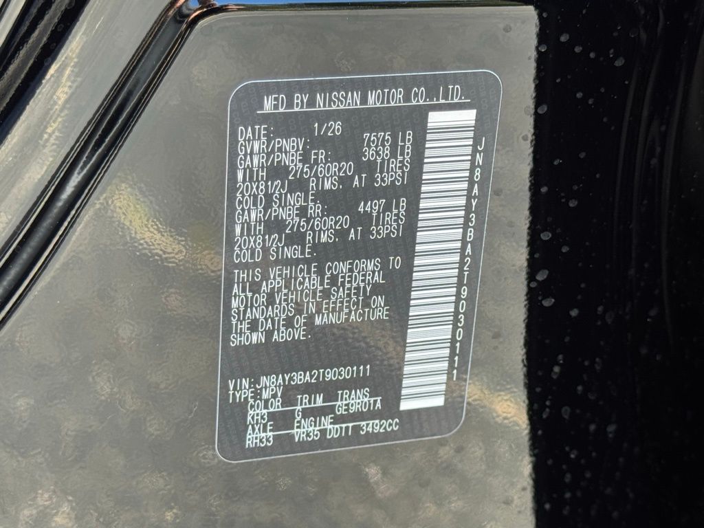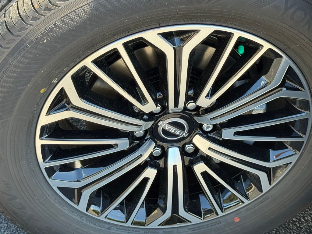 Captain's Chair Seat Package (2nd Row Center Console with Two Cupholders, 2nd Row Outboard Captain's Chairs with Armrests, and EZ Flex Second Row Seating System with One Touch Release), 12 Speakers, 3rd row seats: split-bench, 4-Wheel Disc Brakes, ABS brakes, Air Conditioning, Alloy wheels, AM/FM radio: SiriusXM w/360L, Anti-whiplash front head restraints, Apple CarPlay/Android Auto, Auto High-beam Headlights, Auto tilt-away steering wheel, Auto-dimming door mirrors, Auto-dimming Rear-View mirror, Auto-leveling suspension, Automatic temperature control, Brake assist, Bumpers: body-color, Carpeted Floor Mats with Captain Chairs, Center Front Spoiler, Compass, Cross Bars, Delay-off headlights, Driver door bin, Driver vanity mirror, Dual front impact airbags, Dual front side impact airbags, Electronic Stability Control, Emergency communication system: NissanConnect Services, Four wheel independent suspension, Front anti-roll bar, Front Bucket Seats, Front Center Armrest, Front dual zone A/C, Front reading lights, Fully automatic headlights, Garage door transmitter: myQ Connected Garage, Genuine wood dashboard insert, Heated door mirrors, Heated Front Bucket Seats, Heated front seats, Heated steering wheel, HVAC memory, Illuminated entry, Knee airbag, Leather steering wheel, Low tire pressure warning, Memory seat, Navigation system: Google Maps, Occupant sensing airbag, Outside temperature display, Overhead airbag, Overhead console, Panic alarm, Passenger door bin, Passenger vanity mirror, Power door mirrors, Power driver seat, Power Liftgate, Power passenger seat, Power steering, Power windows, Radio: NissanConnect with SiriusXM 360L, Rain sensing wipers, Rear air conditioning, Rear anti-roll bar, Rear Bumper Protector, Rear reading lights, Rear seat center armrest, Rear window defroster, Rear window wiper, Reclining 3rd row seat, Remote keyless entry, Security system, Speed control, Speed-sensing steering, Speed-Sensitive Wipers, Splash Guards, Split folding rear seat, Spoiler, Steering wheel memory, Steering wheel mounted audio controls, Tachometer, TailorFit Seat Trim, Telescoping steering wheel, Tilt steering wheel, Traction control, Trip computer, Turn signal indicator mirrors, USB Charging Cables, Variably intermittent wipers, Voltmeter, and Wheels: 20" x 8.5J Machined and Painted Alloy.