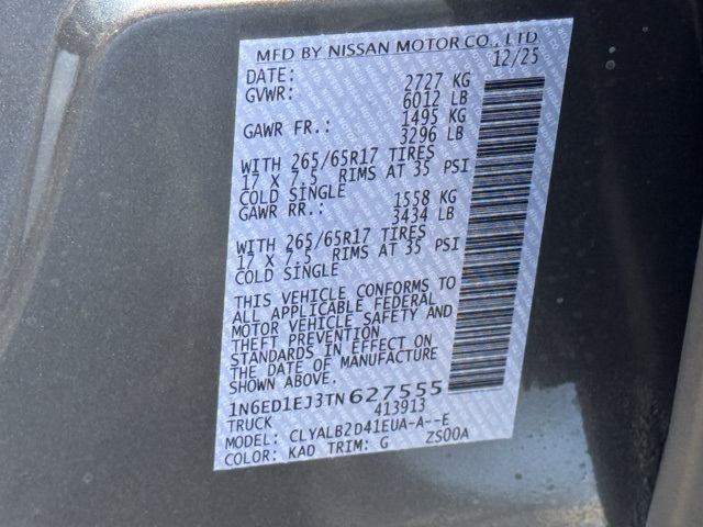 Tow Package, 17" Alloy Wheels, 3.692 Axle Ratio, 4-Wheel Disc Brakes, 6 Speakers, ABS brakes, Air Conditioning, Alloy wheels, AM/FM radio: SiriusXM, Anti-whiplash front head restraints, Auto High-beam Headlights, Blind Spot Warning, Brake assist, Bumpers: body-color, Carpeted Floor Mats, Delay-off headlights, Driver door bin, Driver vanity mirror, Drop-In Bed Liner & Bumper Step, Dual front impact airbags, Dual front side impact airbags, Electronic Stability Control, Emergency communication system, Front anti-roll bar, Front Bucket Seats, Front Center Armrest, Front reading lights, Front wheel independent suspension, Fully automatic headlights, Illuminated entry, Knee airbag, Low tire pressure warning, Occupant sensing airbag, Overhead airbag, Overhead console, Panic alarm, Passenger door bin, Passenger vanity mirror, Power door mirrors, Power driver seat, Power steering, Power windows, Premium Cloth Seat Trim, Radio data system, Radio: SXM/AM/FM/AUX/USB Audio System, Rear anti-roll bar, Rear seat center armrest, Rear side impact airbag, Rear step bumper, Remote keyless entry, Security system, Speed control, Speed-sensing steering, Splash Guards, Split folding rear seat, Steering wheel mounted audio controls, Tachometer, Telescoping steering wheel, Tilt steering wheel, Tow/Haul Mode Switch, Traction control, Trip computer, Variably intermittent wipers, Voltmeter, and Wireless Apple CarPlay/Wireless Android Auto. Price includes: $2500 - Nissan Customer Cash. Exp. 03/02/2026 Price includes dealer added accessories.