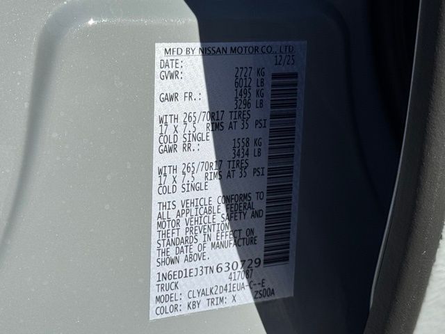 PRO-X Convenience Package (Heated Steering Wheel, Intelligent Around View Monitor (I-AVM), and Wireless Charging For Personal Devices), Tow Package, 17" Painted Alloy Wheels, 3.692 Axle Ratio, 4-Wheel Disc Brakes, 6 Speakers, ABS brakes, Air Conditioning, Alloy wheels, AM/FM radio, Anti-whiplash front head restraints, Auto High-beam Headlights, Automatic temperature control, Blind Spot Warning, Brake assist, Bumpers: body-color, Carpeted Floor Mats, Delay-off headlights, Driver door bin, Driver vanity mirror, Dual front impact airbags, Dual front side impact airbags, Electronic Stability Control, Electronic Tailgate Lock, Emergency communication system, Front anti-roll bar, Front Bucket Seats, Front Center Armrest, Front dual zone A/C, Front fog lights, Front reading lights, Front wheel independent suspension, Fully automatic headlights, Heated Front Bucket Seats, Heated steering wheel, Illuminated entry, Knee airbag, Leather steering wheel, Low tire pressure warning, Mud Flaps, Occupant sensing airbag, Off-Road Style Step Rails, Overhead airbag, Overhead console, Panic alarm, Passenger door bin, Passenger vanity mirror, Power door mirrors, Power driver seat, Power passenger seat, Power steering, Power windows, Premium Paint, PRO Embroidered Premium Cloth Seat Trim, Radio data system, Radio: SiriusXM/AM/FM/Auxiliary/USB Audio System, Rear anti-roll bar, Rear seat center armrest, Rear side impact airbag, Rear step bumper, Remote keyless entry, Security system, Speed control, Speed-sensing steering, Split folding rear seat, Steering wheel mounted audio controls, Tachometer, Telescoping steering wheel, Tilt steering wheel, Traction control, Trip computer, USB Charging Cable Kit, Variably intermittent wipers, Voltmeter, and Wireless Apple CarPlay/Wireless Android Auto. Price includes: $3500 - Nissan Customer Cash. Exp. 05/04/2026 Price includes dealer added accessories.