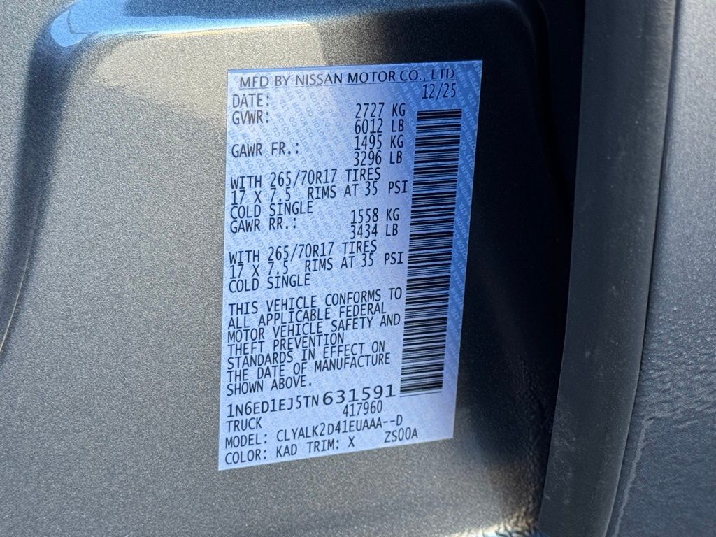 Tow Package, 17" Painted Alloy Wheels, 3.692 Axle Ratio, 4-Wheel Disc Brakes, 6 Speakers, ABS brakes, Air Conditioning, Alloy wheels, Anti-whiplash front head restraints, Auto High-beam Headlights, Automatic temperature control, Blind Spot Warning, Brake assist, Bumpers: body-color, Carpeted Floor Mats, Delay-off headlights, Driver door bin, Driver vanity mirror, Dual front impact airbags, Dual front side impact airbags, Electronic Stability Control, Emergency communication system, Front anti-roll bar, Front Bucket Seats, Front Center Armrest, Front dual zone A/C, Front fog lights, Front reading lights, Front wheel independent suspension, Fully automatic headlights, Heated Front Bucket Seats, Heated steering wheel, Illuminated entry, Knee airbag, Leather steering wheel, Low tire pressure warning, Mud Flaps, Occupant sensing airbag, Off-Road Style Step Rails, Overhead airbag, Overhead console, Panic alarm, Passenger door bin, Passenger vanity mirror, Power door mirrors, Power driver seat, Power passenger seat, Power steering, Power windows, PRO Embroidered Premium Cloth Seat Trim, Radio data system, Rear anti-roll bar, Rear seat center armrest, Rear side impact airbag, Rear step bumper, Remote keyless entry, Security system, Speed control, Speed-sensing steering, Split folding rear seat, Steering wheel mounted audio controls, Tachometer, Telescoping steering wheel, Tilt steering wheel, Traction control, Trip computer, USB Charging Cable Kit, Variably intermittent wipers, Voltmeter, and Wireless Apple CarPlay/Wireless Android Auto. Price includes all rebates: $3500 - Nissan Customer Cash. Exp. 05/04/2026