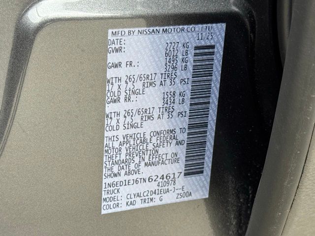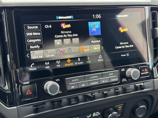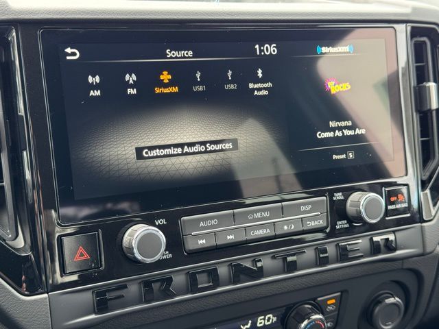 Dark Armor Package (Dark FRONTIER Tailgate Lettering, Dark Grille Surround/Mesh/Inner Fascia, Dark Mirror Caps, and Wheels: 17" Dark), SV Convenience Package (120V Power Outlet in Bed, 120V Power Outlet in Rear Center Console, Bed Under-Rail Lighting, Heated Front Seats, Heated Leather Steering Wheel, Heated Outside Mirrors, HVAC Dual-Zone Front Auto a/C, I-Key with Request Switches on O/S Handles, Locking Glove Box, Remote Engine Starter, Spray-in Bedliner, Tow/Haul Mode Switch, Trailer Hitch with Wiring Harness, and Utili-Track System), Tow Package, 17" Alloy Wheels, 3.692 Axle Ratio, 4-Wheel Disc Brakes, 6 Speakers, ABS brakes, Air Conditioning, Alloy wheels, AM/FM radio, Anti-whiplash front head restraints, Auto High-beam Headlights, Black Tailgate Logo Insert, Blind Spot Warning, Brake assist, Bumpers: body-color, Carpeted Floor Mats, Delay-off headlights, Driver door bin, Driver vanity mirror, Dual front impact airbags, Dual front side impact airbags, Electronic Stability Control, Electronic Tailgate Lock, Emergency communication system, Front anti-roll bar, Front Bucket Seats, Front Center Armrest, Front reading lights, Front wheel independent suspension, Fully automatic headlights, Illuminated entry, Knee airbag, Low tire pressure warning, Occupant sensing airbag, Overhead airbag, Overhead console, Panic alarm, Passenger door bin, Passenger vanity mirror, Power door mirrors, Power driver seat, Power steering, Power windows, Premium Cloth Seat Trim, Radio data system, Radio: SiriusXM/AM/FM/Auxiliary/USB Audio System, Rear anti-roll bar, Rear seat center armrest, Rear side impact airbag, Rear step bumper, Remote keyless entry, Security system, Speed control, Speed-sensing steering, Splash Guards, Split folding rear seat, Steering wheel mounted audio controls, Tachometer, Telescoping steering wheel, Tilt steering wheel, Traction control, Trip computer, Variably intermittent wipers, Voltmeter, and Wireless Apple CarPlay/Wireless Android Auto. Price includes: $3500 - Nissan Customer Cash. Exp. 05/04/2026 Price includes dealer added accessories.