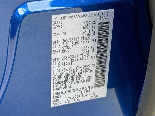 SV Convenience Package (120V Power Outlet in Bed, 120V Power Outlet in Rear Center Console, Bed Under-Rail Lighting, Heated Front Seats, Heated Leather Steering Wheel, Heated Outside Mirrors, HVAC - Dual-Zone Front Auto A/C, I-Key w/Request Switches on O/S Handles, Locking Glove Box, Remote Engine Starter, Spray-In Bedliner, Tow/Haul Mode Switch, Trailer Hitch w/Wiring Harness, and Utili-Track System), Tow Package (T11), 17" Alloy Wheels, 3.692 Axle Ratio, 4-Wheel Disc Brakes, 6 Speakers, ABS brakes, Air Conditioning, Alloy wheels, AM/FM radio: SiriusXM, Anti-whiplash front head restraints, Auto High-beam Headlights, Blind Spot Warning, Brake assist, Bumpers: body-color, Carpeted Floor Mats, Delay-off headlights, Driver door bin, Driver vanity mirror, Dual front impact airbags, Dual front side impact airbags, Electronic Stability Control, Electronic Tailgate Lock, Emergency communication system, Front anti-roll bar, Front Bucket Seats, Front Center Armrest, Front reading lights, Front wheel independent suspension, Fully automatic headlights, Illuminated entry, Knee airbag, Low tire pressure warning, Occupant sensing airbag, Overhead airbag, Overhead console, Panic alarm, Passenger door bin, Passenger vanity mirror, Power door mirrors, Power driver seat, Power steering, Power windows, Premium Cloth Seat Trim, Premium Paint, Radio data system, Radio: SXM/AM/FM/AUX/USB Audio System, Rear anti-roll bar, Rear seat center armrest, Rear side impact airbag, Rear step bumper, Remote keyless entry, Security system, Speed control, Speed-sensing steering, Splash Guards, Split folding rear seat, Steering wheel mounted audio controls, Tachometer, Telescoping steering wheel, Tilt steering wheel, Traction control, Trip computer, Variably intermittent wipers, Voltmeter, and Wireless Apple CarPlay/Wireless Android Auto. Price includes: $2500 - Nissan Customer Cash. Exp. 03/02/2026 Price includes dealer added accessories.