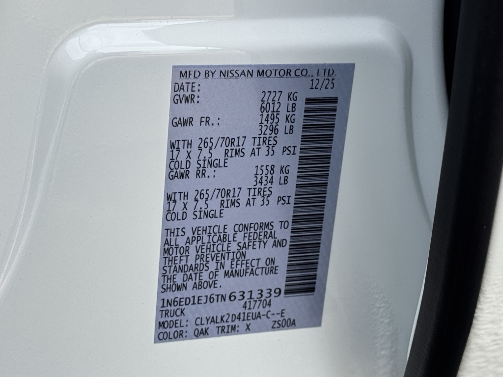 PRO-X Convenience Package (Heated Steering Wheel, Intelligent Around View Monitor (I-AVM), and Wireless Charging for Personal Devices), 17" Painted Alloy Wheels, 3.692 Axle Ratio, 4-Wheel Disc Brakes, 6 Speakers, ABS brakes, Air Conditioning, Alloy wheels, AM/FM radio: SiriusXM, Anti-whiplash front head restraints, Auto High-beam Headlights, Automatic temperature control, Blind Spot Warning, Brake assist, Bumpers: body-color, Carpeted Floor Mats, Delay-off headlights, Driver door bin, Driver vanity mirror, Dual front impact airbags, Dual front side impact airbags, Electronic Stability Control, Electronic Tailgate Lock, Emergency communication system, Front anti-roll bar, Front Bucket Seats, Front Center Armrest, Front dual zone A/C, Front fog lights, Front reading lights, Front wheel independent suspension, Fully automatic headlights, Heated Front Bucket Seats, Heated steering wheel, Illuminated entry, Knee airbag, Leather steering wheel, Low tire pressure warning, Mud Flaps, Occupant sensing airbag, Off-Road Style Step Rails, Overhead airbag, Overhead console, Panic alarm, Passenger door bin, Passenger vanity mirror, Power door mirrors, Power driver seat, Power passenger seat, Power steering, Power windows, PRO Embroidered Premium Cloth Seat Trim, Radio data system, Radio: SXM/AM/FM/AUX/USB Audio System, Rear anti-roll bar, Rear seat center armrest, Rear side impact airbag, Rear step bumper, Remote keyless entry, Security system, Speed control, Speed-sensing steering, Split folding rear seat, Steering wheel mounted audio controls, Tachometer, Telescoping steering wheel, Tilt steering wheel, Traction control, Trip computer, USB Charging Cable Kit, Variably intermittent wipers, Voltmeter, and Wireless Apple CarPlay/Wireless Android Auto. Price includes all rebates: $2500 - Nissan Customer Cash. Exp. 03/02/2026