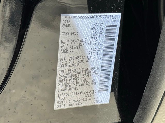SV Convenience Package (120V Power Outlet in Bed, 120V Power Outlet in Rear Center Console, Bed Under-Rail Lighting, Heated Front Seats, Heated Leather Steering Wheel, Heated Outside Mirrors, HVAC Dual-Zone Front Auto a/C, I-Key with Request Switches on O/S Handles, Locking Glove Box, Remote Engine Starter, Spray-in Bedliner, Tow/Haul Mode Switch, Trailer Hitch with Wiring Harness, and Utili-Track System), Tow Package, 17" Alloy Wheels, 3.692 Axle Ratio, 4-Wheel Disc Brakes, 6 Speakers, ABS brakes, Air Conditioning, Alloy wheels, AM/FM radio, Anti-whiplash front head restraints, Auto High-beam Headlights, Blind Spot Warning, Brake assist, Bumpers: body-color, Carpeted Floor Mats, Delay-off headlights, Driver door bin, Driver vanity mirror, Dual front impact airbags, Dual front side impact airbags, Electronic Stability Control, Electronic Tailgate Lock, Emergency communication system, Front anti-roll bar, Front Bucket Seats, Front Center Armrest, Front reading lights, Front wheel independent suspension, Fully automatic headlights, Illuminated entry, Knee airbag, Low tire pressure warning, Occupant sensing airbag, Overhead airbag, Overhead console, Panic alarm, Passenger door bin, Passenger vanity mirror, Power door mirrors, Power driver seat, Power steering, Power windows, Premium Cloth Seat Trim, Radio data system, Radio: SiriusXM/AM/FM/Auxiliary/USB Audio System, Rear anti-roll bar, Rear seat center armrest, Rear side impact airbag, Rear step bumper, Remote keyless entry, Security system, Speed control, Speed-sensing steering, Splash Guards, Split folding rear seat, Steering wheel mounted audio controls, Tachometer, Telescoping steering wheel, Tilt steering wheel, Traction control, Trip computer, Variably intermittent wipers, Voltmeter, and Wireless Apple CarPlay/Wireless Android Auto. Price includes: $3500 - Nissan Customer Cash. Exp. 05/04/2026 Price includes dealer added accessories.