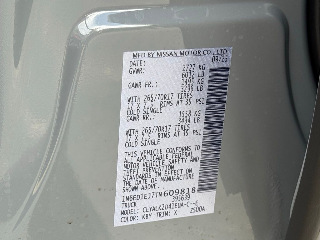 PRO-X Convenience Package (Heated Steering Wheel and Intelligent Around View Monitor (I-AVM)), 17" Painted Alloy Wheels, 3.692 Axle Ratio, 4-Wheel Disc Brakes, 6 Speakers, ABS brakes, Air Conditioning, Alloy wheels, Anti-whiplash front head restraints, Auto High-beam Headlights, Automatic temperature control, Blind Spot Warning, Brake assist, Bumpers: body-color, Carpeted Floor Mats, Delay-off headlights, Driver door bin, Driver vanity mirror, Dual front impact airbags, Dual front side impact airbags, Electronic Stability Control, Electronic Tailgate Lock, Emergency communication system, Front anti-roll bar, Front Bucket Seats, Front Center Armrest, Front dual zone A/C, Front fog lights, Front reading lights, Front wheel independent suspension, Fully automatic headlights, Heated Front Bucket Seats, Heated steering wheel, Illuminated entry, Knee airbag, Leather steering wheel, Low tire pressure warning, Mud Flaps, Occupant sensing airbag, Off-Road Style Step Rails, Overhead airbag, Overhead console, Panic alarm, Passenger door bin, Passenger vanity mirror, Power door mirrors, Power driver seat, Power passenger seat, Power steering, Power windows, Premium Paint, PRO Embroidered Premium Cloth Seat Trim, Radio data system, Rear anti-roll bar, Rear seat center armrest, Rear side impact airbag, Rear step bumper, Remote keyless entry, Security system, Speed control, Speed-sensing steering, Split folding rear seat, Steering wheel mounted audio controls, Tachometer, Telescoping steering wheel, Tilt steering wheel, Traction control, Trip computer, Variably intermittent wipers, Voltmeter, and Wireless Apple CarPlay/Wireless Android Auto. Price includes all rebates: $3500 - Nissan Customer Cash. Exp. 05/04/2026