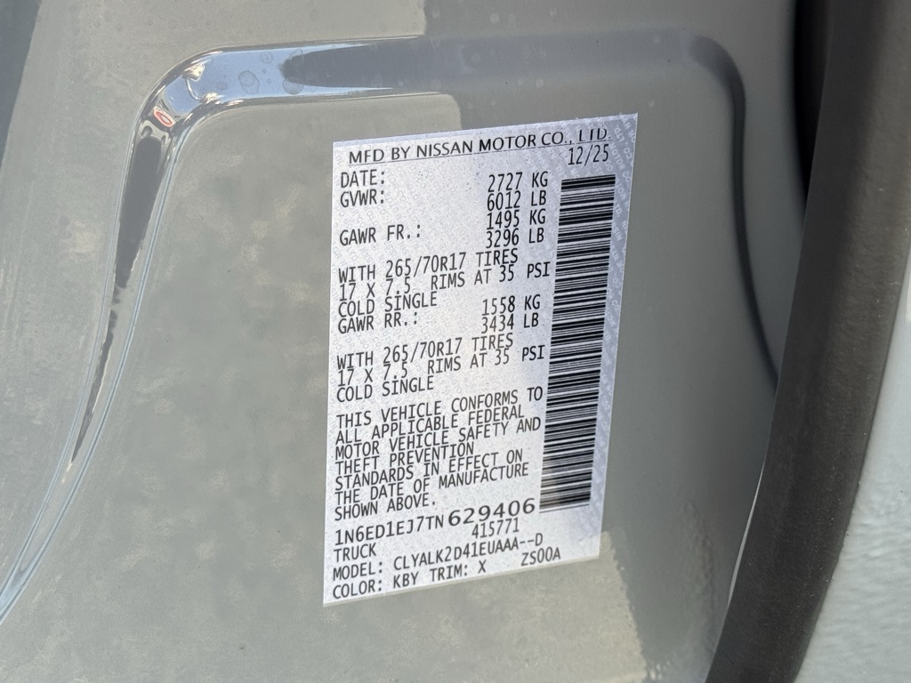 Tow Package, 17" Painted Alloy Wheels, 3.692 Axle Ratio, 4-Wheel Disc Brakes, 6 Speakers, ABS brakes, Air Conditioning, Alloy wheels, AM/FM radio: SiriusXM, Anti-whiplash front head restraints, Auto High-beam Headlights, Automatic temperature control, Blind Spot Warning, Brake assist, Bumpers: body-color, Carpeted Floor Mats, Delay-off headlights, Driver door bin, Driver vanity mirror, Drop-In Bed Liner & Bumper Step, Dual front impact airbags, Dual front side impact airbags, Electronic Stability Control, Emergency communication system, Front anti-roll bar, Front Bucket Seats, Front Center Armrest, Front dual zone A/C, Front fog lights, Front reading lights, Front wheel independent suspension, Fully automatic headlights, Heated Front Bucket Seats, Heated steering wheel, Illuminated entry, Knee airbag, Leather steering wheel, Low tire pressure warning, Mud Flaps, Occupant sensing airbag, Off-Road Style Step Rails, Overhead airbag, Overhead console, Panic alarm, Passenger door bin, Passenger vanity mirror, Power door mirrors, Power driver seat, Power passenger seat, Power steering, Power windows, Premium Paint, PRO Embroidered Premium Cloth Seat Trim, Radio data system, Radio: SXM/AM/FM/AUX/USB Audio System, Rear anti-roll bar, Rear seat center armrest, Rear side impact airbag, Rear step bumper, Remote keyless entry, Security system, Speed control, Speed-sensing steering, Split folding rear seat, Steering wheel mounted audio controls, Tachometer, Telescoping steering wheel, Tilt steering wheel, Traction control, Trip computer, Variably intermittent wipers, Voltmeter, and Wireless Apple CarPlay/Wireless Android Auto. Price includes all rebates: $2500 - Nissan Customer Cash. Exp. 03/02/2026