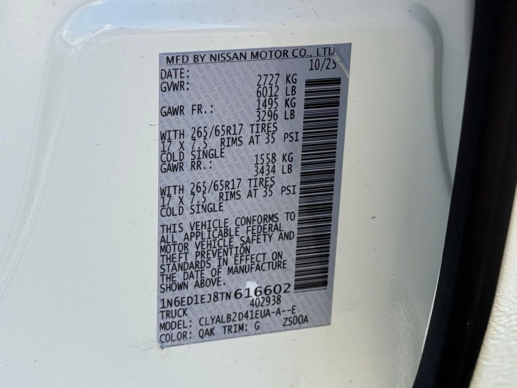 Tow Package, 17" Alloy Wheels, 3.692 Axle Ratio, 4-Wheel Disc Brakes, 6 Speakers, ABS brakes, Air Conditioning, Alloy wheels, Anti-whiplash front head restraints, Auto High-beam Headlights, Blind Spot Warning, Brake assist, Bumpers: body-color, Carpeted Floor Mats, Delay-off headlights, Driver door bin, Driver vanity mirror, Dual front impact airbags, Dual front side impact airbags, Electronic Stability Control, Emergency communication system, Front anti-roll bar, Front Bucket Seats, Front Center Armrest, Front reading lights, Front wheel independent suspension, Fully automatic headlights, Illuminated entry, Knee airbag, Low tire pressure warning, Occupant sensing airbag, Overhead airbag, Overhead console, Panic alarm, Passenger door bin, Passenger vanity mirror, Power door mirrors, Power driver seat, Power steering, Power windows, Premium Cloth Seat Trim, Radio data system, Rear anti-roll bar, Rear seat center armrest, Rear side impact airbag, Rear step bumper, Remote keyless entry, Security system, Speed control, Speed-sensing steering, Splash Guards, Split folding rear seat, Steering wheel mounted audio controls, Tachometer, Telescoping steering wheel, Tilt steering wheel, Tow/Haul Mode Switch, Traction control, Trip computer, Variably intermittent wipers, Voltmeter, and Wireless Apple CarPlay/Wireless Android Auto. Price includes all rebates: $3500 - Nissan Customer Cash. Exp. 05/04/2026