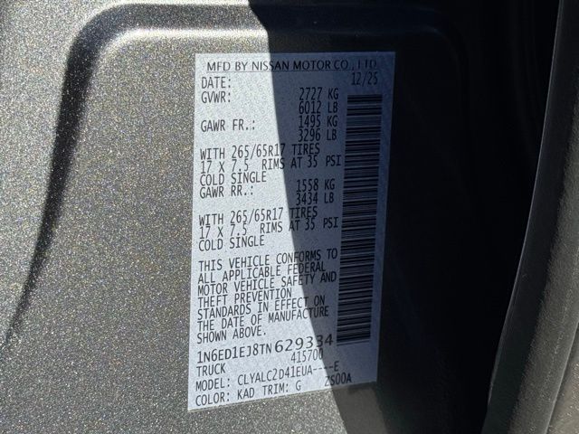 SV Convenience Package (120V Power Outlet in Bed, 120V Power Outlet in Rear Center Console, Bed Under-Rail Lighting, Heated Front Seats, Heated Leather Steering Wheel, Heated Outside Mirrors, HVAC Dual-Zone Front Auto a/C, I-Key with Request Switches on O/S Handles, Locking Glove Box, Remote Engine Starter, Spray-in Bedliner, Tow/Haul Mode Switch, Trailer Hitch with Wiring Harness, and Utili-Track System), Tow Package, 17" Alloy Wheels, 3.692 Axle Ratio, 4-Wheel Disc Brakes, 6 Speakers, ABS brakes, Air Conditioning, Alloy wheels, AM/FM radio, Anti-whiplash front head restraints, Auto High-beam Headlights, Blind Spot Warning, Brake assist, Bumpers: body-color, Carpeted Floor Mats, Delay-off headlights, Driver door bin, Driver vanity mirror, Dual front impact airbags, Dual front side impact airbags, Electronic Stability Control, Electronic Tailgate Lock, Emergency communication system, Front anti-roll bar, Front Bucket Seats, Front Center Armrest, Front reading lights, Front wheel independent suspension, Fully automatic headlights, Illuminated entry, Knee airbag, Low tire pressure warning, Occupant sensing airbag, Overhead airbag, Overhead console, Panic alarm, Passenger door bin, Passenger vanity mirror, Power door mirrors, Power driver seat, Power steering, Power windows, Premium Cloth Seat Trim, Radio data system, Radio: SiriusXM/AM/FM/Auxiliary/USB Audio System, Rear anti-roll bar, Rear seat center armrest, Rear side impact airbag, Rear step bumper, Remote keyless entry, Security system, Speed control, Speed-sensing steering, Splash Guards, Split folding rear seat, Steering wheel mounted audio controls, Tachometer, Telescoping steering wheel, Tilt steering wheel, Traction control, Trip computer, Variably intermittent wipers, Voltmeter, and Wireless Apple CarPlay/Wireless Android Auto. Price includes: $3500 - Nissan Customer Cash. Exp. 05/04/2026 Price includes dealer added accessories.