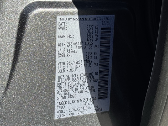SV Convenience Package (120V Power Outlet in Bed, 120V Power Outlet in Rear Center Console, Bed Under-Rail Lighting, Heated Front Seats, Heated Leather Steering Wheel, Heated Outside Mirrors, HVAC - Dual-Zone Front Auto A/C, I-Key w/Request Switches on O/S Handles, Locking Glove Box, Remote Engine Starter, Spray-In Bedliner, Tow/Haul Mode Switch, Trailer Hitch w/Wiring Harness, and Utili-Track System), Tow Package (T11), 17" Alloy Wheels, 3.692 Axle Ratio, 4-Wheel Disc Brakes, 6 Speakers, ABS brakes, Air Conditioning, Alloy wheels, AM/FM radio: SiriusXM, Anti-whiplash front head restraints, Auto High-beam Headlights, Blind Spot Warning, Brake assist, Bumpers: body-color, Carpeted Floor Mats, Delay-off headlights, Driver door bin, Driver vanity mirror, Dual front impact airbags, Dual front side impact airbags, Electronic Stability Control, Electronic Tailgate Lock, Emergency communication system, Front anti-roll bar, Front Bucket Seats, Front Center Armrest, Front reading lights, Front wheel independent suspension, Fully automatic headlights, Illuminated entry, Knee airbag, Low tire pressure warning, Occupant sensing airbag, Overhead airbag, Overhead console, Panic alarm, Passenger door bin, Passenger vanity mirror, Power door mirrors, Power driver seat, Power steering, Power windows, Premium Cloth Seat Trim, Radio data system, Radio: SXM/AM/FM/AUX/USB Audio System, Rear anti-roll bar, Rear seat center armrest, Rear side impact airbag, Rear step bumper, Remote keyless entry, Security system, Speed control, Speed-sensing steering, Splash Guards, Split folding rear seat, Steering wheel mounted audio controls, Tachometer, Telescoping steering wheel, Tilt steering wheel, Traction control, Trip computer, Variably intermittent wipers, Voltmeter, and Wireless Apple CarPlay/Wireless Android Auto. Price includes: $2500 - Nissan Customer Cash. Exp. 03/02/2026 Price includes dealer added accessories.