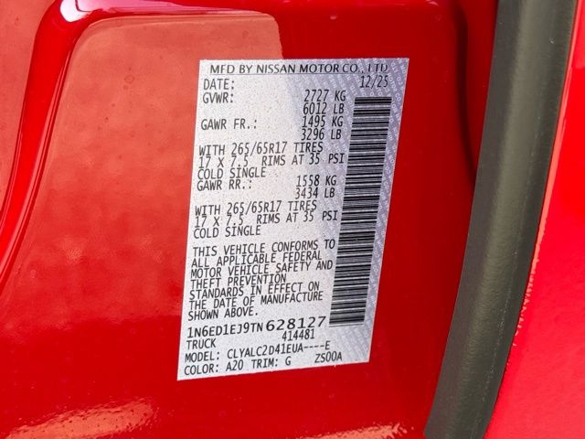 SV Convenience Package (120V Power Outlet in Bed, 120V Power Outlet in Rear Center Console, Bed Under-Rail Lighting, Heated Front Seats, Heated Leather Steering Wheel, Heated Outside Mirrors, HVAC Dual-Zone Front Auto a/C, I-Key with Request Switches on O/S Handles, Locking Glove Box, Remote Engine Starter, Spray-in Bedliner, Tow/Haul Mode Switch, Trailer Hitch with Wiring Harness, and Utili-Track System), Tow Package, 17" Alloy Wheels, 3.692 Axle Ratio, 4-Wheel Disc Brakes, 6 Speakers, ABS brakes, Air Conditioning, Alloy wheels, AM/FM radio, Anti-whiplash front head restraints, Auto High-beam Headlights, Blind Spot Warning, Brake assist, Bumpers: body-color, Carpeted Floor Mats, Delay-off headlights, Driver door bin, Driver vanity mirror, Dual front impact airbags, Dual front side impact airbags, Electronic Stability Control, Electronic Tailgate Lock, Emergency communication system, Front anti-roll bar, Front Bucket Seats, Front Center Armrest, Front reading lights, Front wheel independent suspension, Fully automatic headlights, Illuminated entry, Knee airbag, Low tire pressure warning, Occupant sensing airbag, Overhead airbag, Overhead console, Panic alarm, Passenger door bin, Passenger vanity mirror, Power door mirrors, Power driver seat, Power steering, Power windows, Premium Cloth Seat Trim, Radio data system, Radio: SiriusXM/AM/FM/Auxiliary/USB Audio System, Rear anti-roll bar, Rear seat center armrest, Rear side impact airbag, Rear step bumper, Remote keyless entry, Security system, Speed control, Speed-sensing steering, Splash Guards, Split folding rear seat, Steering wheel mounted audio controls, Tachometer, Telescoping steering wheel, Tilt steering wheel, Traction control, Trip computer, Variably intermittent wipers, Voltmeter, and Wireless Apple CarPlay/Wireless Android Auto. Price includes: $3500 - Nissan Customer Cash. Exp. 05/04/2026 Price includes dealer added accessories.