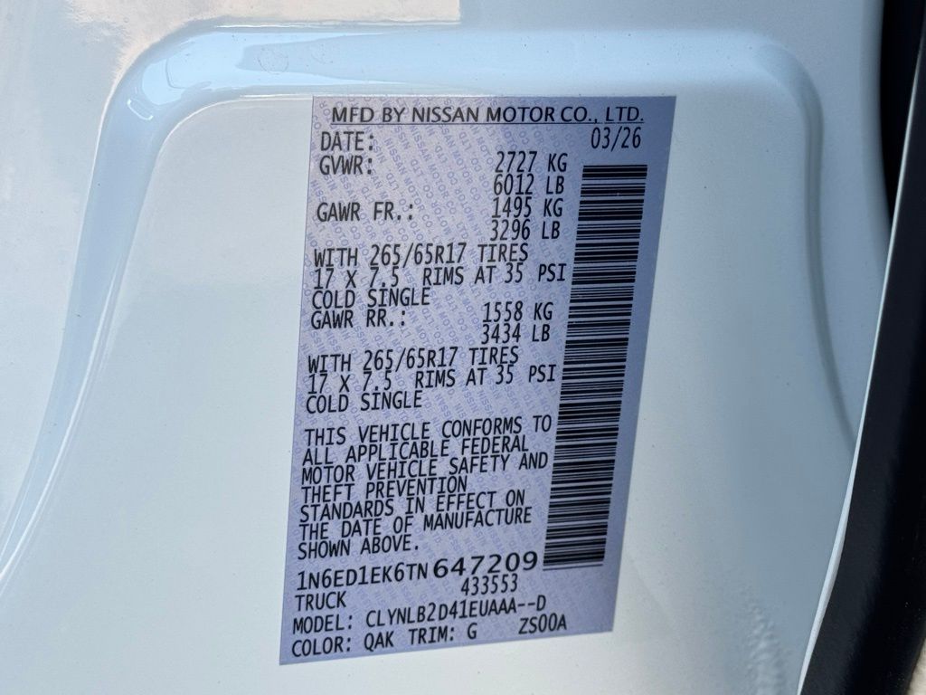 All-Weather Content Package (Heated Front Seats, Heated Leather Steering Wheel, HVAC Dual-Zone Front Auto a/C, and Remote Engine Starter), 4WD, 17" Alloy Wheels, 3.692 Axle Ratio, 4-Wheel Disc Brakes, 6 Speakers, ABS brakes, Air Conditioning, All Season Floor Mats, Alloy wheels, AM/FM radio: SiriusXM, Anti-whiplash front head restraints, Auto High-beam Headlights, Blind Spot Warning, Brake assist, Bumpers: body-color, Delay-off headlights, Driver door bin, Driver vanity mirror, Drop-in Bed Liner & Bumper Step, Dual front impact airbags, Dual front side impact airbags, Electronic Stability Control, Emergency communication system, Front anti-roll bar, Front Bucket Seats, Front Center Armrest, Front reading lights, Front wheel independent suspension, Fully automatic headlights, Illuminated entry, Knee airbag, Low tire pressure warning, Occupant sensing airbag, Overhead airbag, Overhead console, Panic alarm, Passenger door bin, Passenger vanity mirror, Power door mirrors, Power driver seat, Power steering, Power windows, Premium Cloth Seat Trim, Radio data system, Radio: SiriusXM/AM/FM/Auxiliary/USB Audio System, Rear anti-roll bar, Rear seat center armrest, Rear side impact airbag, Rear step bumper, Remote keyless entry, Security system, Speed control, Speed-sensing steering, Splash Guards, Split folding rear seat, Steering wheel mounted audio controls, Tachometer, Telescoping steering wheel, Tilt steering wheel, Tow/Haul Mode Switch, Traction control, Trip computer, USB Charging Cable Kit, Variably intermittent wipers, Voltmeter, and Wireless Apple CarPlay/Wireless Android Auto. Price includes all rebates: $3500 - Nissan Customer Cash. Exp. 05/04/2026