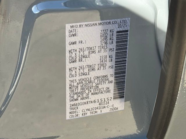 PRO-4X Convenience Package (Heated Steering Wheel, Intelligent Around View Monitor (I-AVM), and Wireless Charging For Personal Devices), Tow Package, 17" Painted Alloy Wheels, 3.692 Axle Ratio, 4-Wheel Disc Brakes, 6 Speakers, ABS brakes, Air Conditioning, Alloy wheels, AM/FM radio: SiriusXM, Anti-whiplash front head restraints, Auto High-beam Headlights, Automatic temperature control, Blind Spot Warning, Brake assist, Bumpers: body-color, Delay-off headlights, Driver door bin, Driver vanity mirror, Dual front impact airbags, Dual front side impact airbags, Electronic Stability Control, Electronic Tailgate Lock, Emergency communication system, Essentials Kit, Front anti-roll bar, Front Bucket Seats, Front Center Armrest, Front dual zone A/C, Front fog lights, Front reading lights, Front wheel independent suspension, Fully automatic headlights, Heated Front Bucket Seats, Heated front seats, Heated steering wheel, Illuminated entry, Knee airbag, Leather steering wheel, Low tire pressure warning, Mud Flaps, Occupant sensing airbag, Off-Road Style Step Rails, Overhead airbag, Overhead console, Panic alarm, Passenger door bin, Passenger vanity mirror, Power door mirrors, Power driver seat, Power passenger seat, Power steering, Power windows, Premium Paint, PRO Embroidered Premium Cloth Seat Trim, PRO-4X Carpeted Floor Mats, Radio data system, Radio: SiriusXM/AM/FM/Auxiliary/USB Audio System, Rear anti-roll bar, Rear seat center armrest, Rear side impact airbag, Rear step bumper, Remote keyless entry, Security system, Speed control, Speed-sensing steering, Split folding rear seat, Steering wheel mounted audio controls, Tachometer, Telescoping steering wheel, Tilt steering wheel, Traction control, Trip computer, Variably intermittent wipers, Voltmeter, and Wireless Apple CarPlay/Wireless Android Auto. Price includes: $3500 - Nissan Customer Cash. Exp. 05/04/2026 Price includes dealer added accessories.