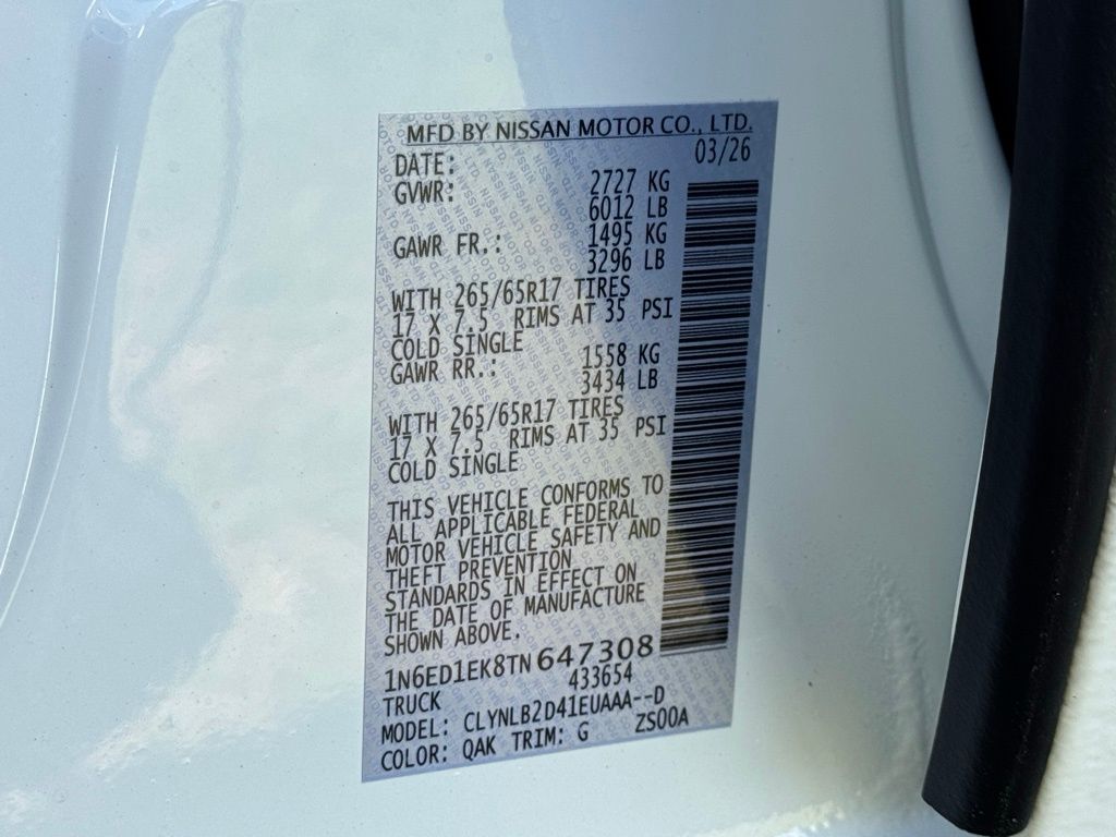 All-Weather Content Package (Heated Front Seats, Heated Leather Steering Wheel, HVAC Dual-Zone Front Auto a/C, and Remote Engine Starter), 4WD, 17" Alloy Wheels, 3.692 Axle Ratio, 4-Wheel Disc Brakes, 6 Speakers, ABS brakes, Air Conditioning, All Season Floor Mats, Alloy wheels, AM/FM radio: SiriusXM, Anti-whiplash front head restraints, Auto High-beam Headlights, Blind Spot Warning, Brake assist, Bumpers: body-color, Delay-off headlights, Driver door bin, Driver vanity mirror, Drop-in Bed Liner & Bumper Step, Dual front impact airbags, Dual front side impact airbags, Electronic Stability Control, Emergency communication system, Front anti-roll bar, Front Bucket Seats, Front Center Armrest, Front reading lights, Front wheel independent suspension, Fully automatic headlights, Illuminated entry, Knee airbag, Low tire pressure warning, Occupant sensing airbag, Overhead airbag, Overhead console, Panic alarm, Passenger door bin, Passenger vanity mirror, Power door mirrors, Power driver seat, Power steering, Power windows, Premium Cloth Seat Trim, Radio data system, Radio: SiriusXM/AM/FM/Auxiliary/USB Audio System, Rear anti-roll bar, Rear seat center armrest, Rear side impact airbag, Rear step bumper, Remote keyless entry, Security system, Speed control, Speed-sensing steering, Splash Guards, Split folding rear seat, Steering wheel mounted audio controls, Tachometer, Telescoping steering wheel, Tilt steering wheel, Tow/Haul Mode Switch, Traction control, Trip computer, USB Charging Cable Kit, Variably intermittent wipers, Voltmeter, and Wireless Apple CarPlay/Wireless Android Auto. Price includes all rebates: $3500 - Nissan Customer Cash. Exp. 05/04/2026