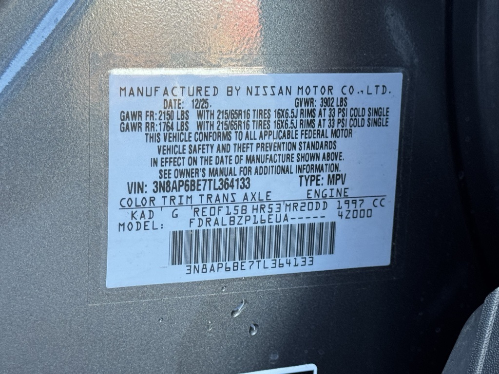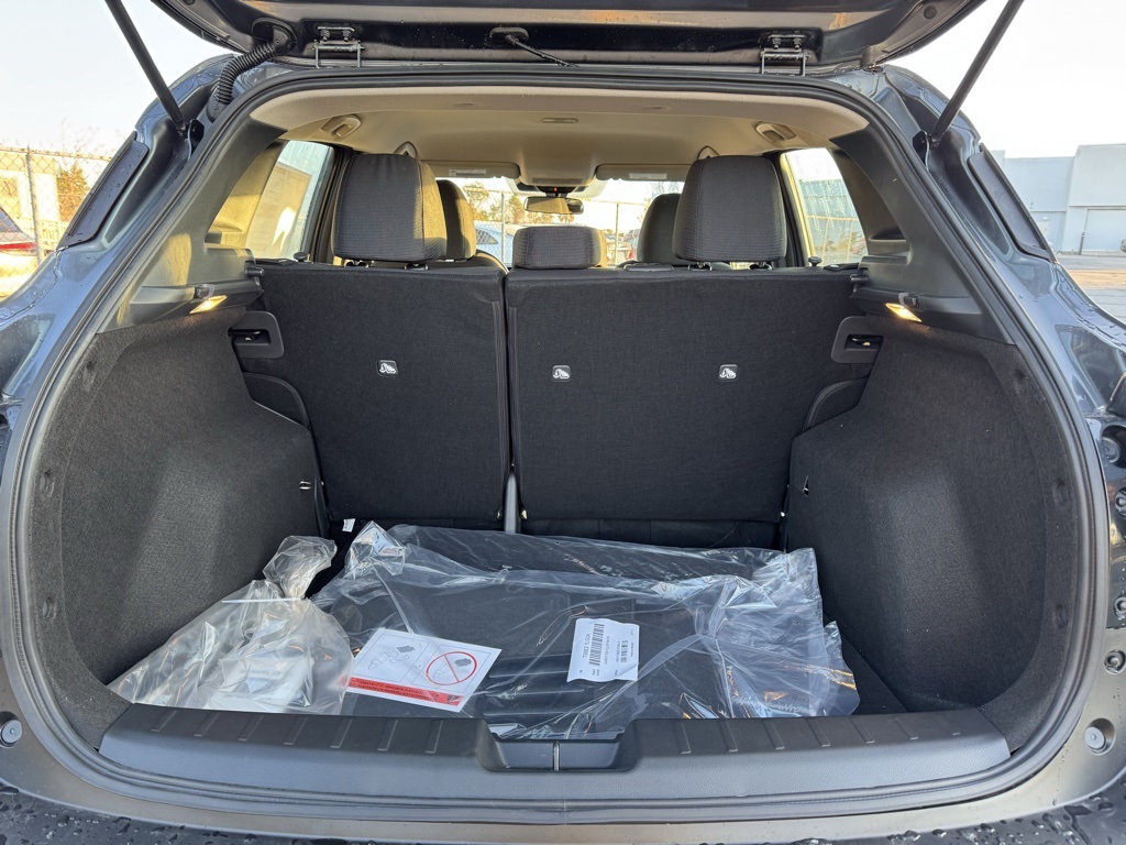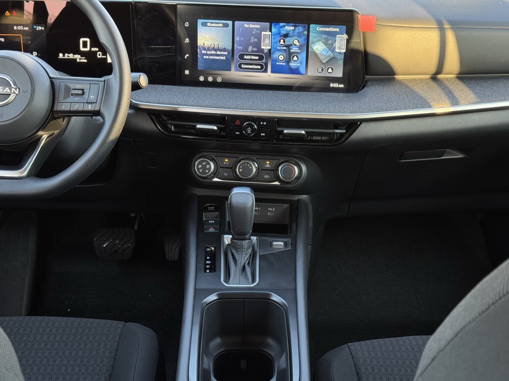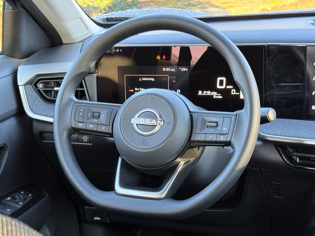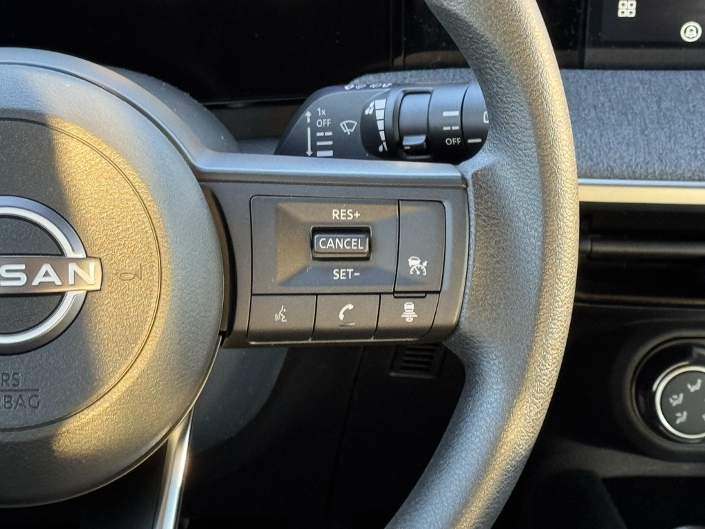 16" Steel Wheels w/Full Covers, 4 Speakers, 4-Wheel Disc Brakes, ABS brakes, Air Conditioning, AM/FM radio, Auto High-beam Headlights, Blind Spot Warning, Brake assist, Bumpers: body-color, Carpeted Floor Mats & Cargo Mat, Cloth Seat Trim, Driver door bin, Driver vanity mirror, Driver's Seat Mounted Armrest, Dual front impact airbags, Dual front side impact airbags, Electronic Stability Control, Emergency communication system, Exterior Parking Camera Rear, Front anti-roll bar, Front Bucket Seats, Front reading lights, Front wheel independent suspension, Fully automatic headlights, Illuminated entry, Knee airbag, Low tire pressure warning, NissanConnect featuring Apple CarPlay and Android Auto, Occupant sensing airbag, Outside temperature display, Overhead airbag, Panic alarm, Passenger door bin, Passenger vanity mirror, Power door mirrors, Power steering, Power windows, Radio data system, Radio: AM/FM/SiriusXM Audio System, Rear anti-roll bar, Rear reading lights, Rear side impact airbag, Rear window defroster, Rear window wiper, Remote keyless entry, Security system, Speed control, Speed-sensing steering, Splash Guards, Split folding rear seat, Spoiler, Sport steering wheel, Steering wheel mounted audio controls, Tachometer, Telescoping steering wheel, Tilt steering wheel, Traction control, Trip computer, and Variably intermittent wipers.