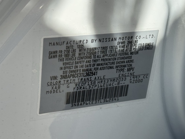 Cold Weather Package (Heated Front Seats, Heated Mirrors, and Rear Floor Heater Ducts), SV Premium Package (Illuminated Driver & Passenger Sun Visors, Panoramic Moonroof, and Sunglass Holder), 2-Tone Premium Paint, 4 Speakers, 4-Wheel Disc Brakes, ABS brakes, Air Conditioning, AM/FM radio, Auto High-beam Headlights, Automatic temperature control, Blind Spot Warning, Brake assist, Bumpers: body-color, Carpeted Floor Mats & Underfloor Protector, Cloth Seat Trim, Crossbars, Driver door bin, Driver vanity mirror, Dual front impact airbags, Dual front side impact airbags, Electronic Stability Control, Emergency communication system, Exterior Parking Camera Rear, Front anti-roll bar, Front Bucket Seats, Front Center Armrest, Front reading lights, Front wheel independent suspension, Fully automatic headlights, Illuminated entry, Knee airbag, Low tire pressure warning, NissanConnect featuring Apple CarPlay and Android Auto, Occupant sensing airbag, Outside temperature display, Overhead airbag, Panic alarm, Passenger door bin, Passenger vanity mirror, Power door mirrors, Power steering, Power windows, Radio data system, Radio: AM/FM/SiriusXM Audio System, Rear anti-roll bar, Rear reading lights, Rear side impact airbag, Rear window defroster, Rear window wiper, Remote keyless entry, Security system, Speed control, Speed-sensing steering, Splash Guards, Split folding rear seat, Spoiler, Sport steering wheel, Steering wheel mounted audio controls, Tachometer, Telescoping steering wheel, Tilt steering wheel, Traction control, Trip computer, Variably intermittent wipers, and Wheels: 17" Steel Flex w/Full Covers. Price includes: $1000 - Nissan Customer Cash. Exp. 03/02/2026 Price includes dealer added accessories.