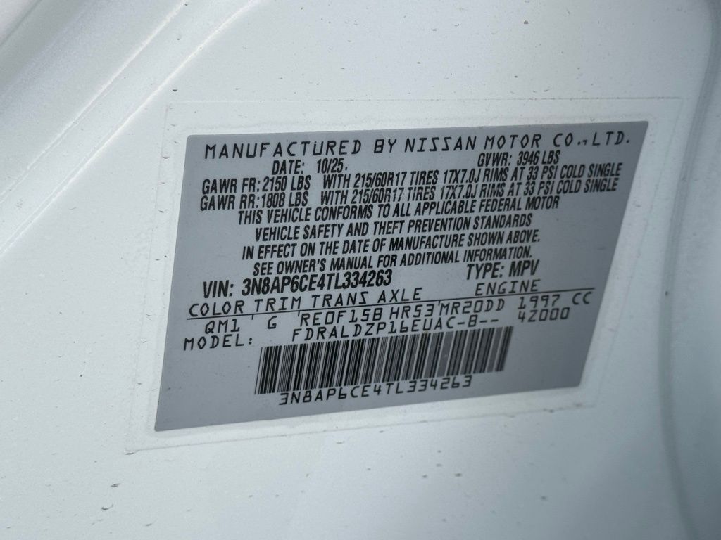 Cold Weather Package (Heated Front Seats, Heated Mirrors, and Rear Floor Heater Ducts), SV Premium Package (Panoramic Moonroof and Sunglass Holder), 4 Speakers, 4-Wheel Disc Brakes, ABS brakes, Air Conditioning, AM/FM radio, Auto High-beam Headlights, Automatic temperature control, Blind Spot Warning, Brake assist, Bumpers: body-color, Cloth Seat Trim, Driver door bin, Driver vanity mirror, Dual front impact airbags, Dual front side impact airbags, Electronic Stability Control, Emergency communication system, Exterior Parking Camera Rear, Front anti-roll bar, Front Bucket Seats, Front Center Armrest, Front reading lights, Front wheel independent suspension, Fully automatic headlights, Illuminated entry, Knee airbag, Low tire pressure warning, NissanConnect featuring Apple CarPlay and Android Auto, Occupant sensing airbag, Outside temperature display, Overhead airbag, Panic alarm, Panoramic Headliner Illumination, Passenger door bin, Passenger vanity mirror, Power door mirrors, Power steering, Power windows, Radio data system, Radio: AM/FM/SiriusXM Audio System, Rear anti-roll bar, Rear reading lights, Rear side impact airbag, Rear window defroster, Rear window wiper, Remote keyless entry, Security system, Speed control, Speed-sensing steering, Splash Guards, Split folding rear seat, Spoiler, Sport steering wheel, Steering wheel mounted audio controls, Tachometer, Telescoping steering wheel, Tilt steering wheel, Traction control, Trip computer, and Variably intermittent wipers. Price includes all rebates: $1000 - Nissan Customer Cash. Exp. 05/04/2026