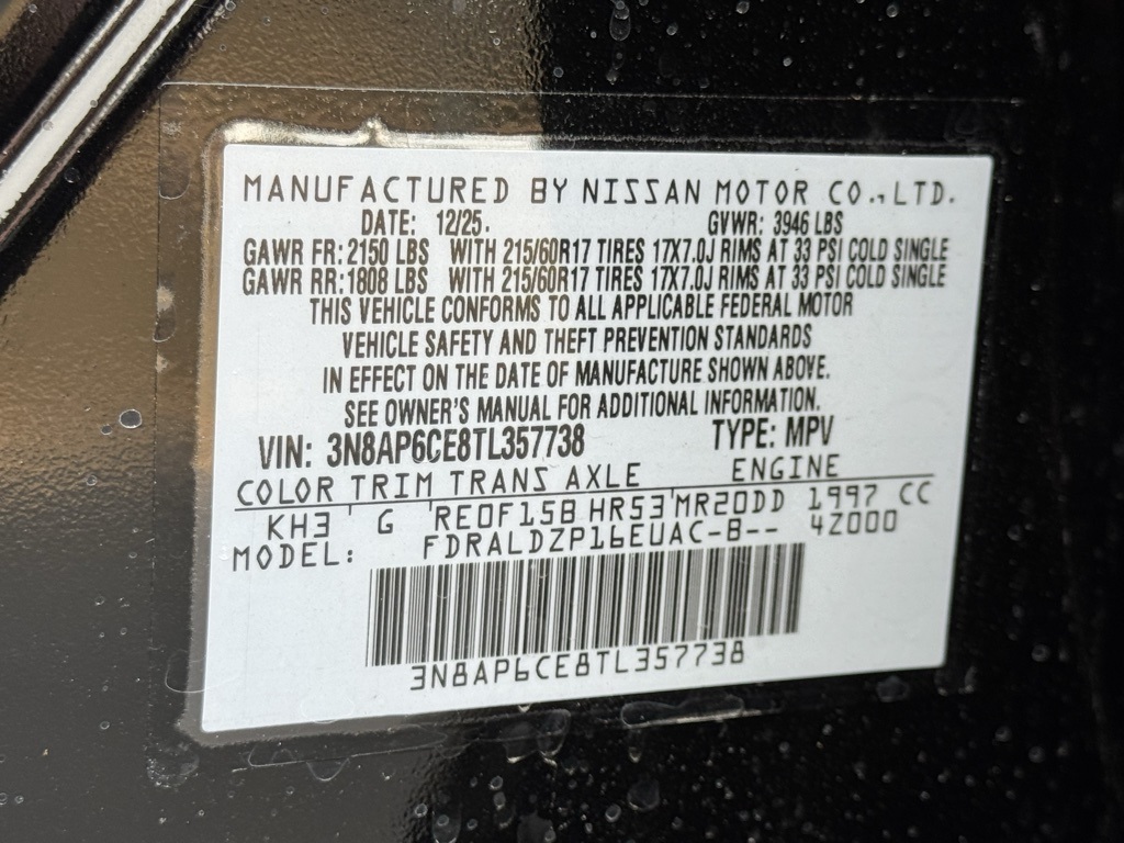 Cold Weather Package (Heated Front Seats, Heated Mirrors, and Rear Floor Heater Ducts), SV Premium Package (Illuminated Driver & Passenger Sun Visors, Panoramic Moonroof, and Sunglass Holder), 4 Speakers, 4-Wheel Disc Brakes, ABS brakes, Air Conditioning, AM/FM radio, Auto High-beam Headlights, Automatic temperature control, Blind Spot Warning, Brake assist, Bumpers: body-color, Carpeted Floor Mats & Underfloor Protector, Cloth Seat Trim, Driver door bin, Driver vanity mirror, Dual front impact airbags, Dual front side impact airbags, Electronic Stability Control, Emergency communication system, Exterior Parking Camera Rear, Front anti-roll bar, Front Bucket Seats, Front Center Armrest, Front reading lights, Front wheel independent suspension, Fully automatic headlights, Illuminated entry, Knee airbag, Low tire pressure warning, NissanConnect featuring Apple CarPlay and Android Auto, Occupant sensing airbag, Outside temperature display, Overhead airbag, Panic alarm, Passenger door bin, Passenger vanity mirror, Power door mirrors, Power steering, Power windows, Radio data system, Radio: AM/FM/SiriusXM Audio System, Rear anti-roll bar, Rear reading lights, Rear side impact airbag, Rear window defroster, Rear window wiper, Remote keyless entry, Security system, Speed control, Speed-sensing steering, Splash Guards, Split folding rear seat, Spoiler, Sport steering wheel, Steering wheel mounted audio controls, Tachometer, Telescoping steering wheel, Tilt steering wheel, Traction control, Trip computer, Variably intermittent wipers, and Wheels: 17" Steel Flex w/Full Covers. Price includes all rebates: $1000 - Nissan Customer Cash. Exp. 03/02/2026