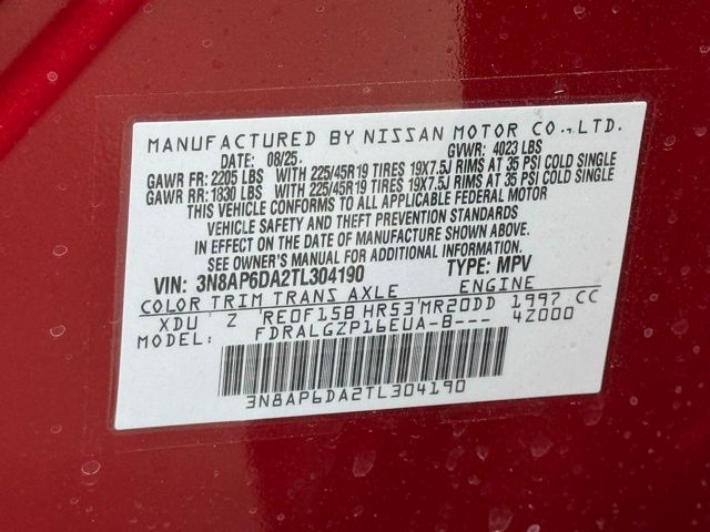 17" Alloy Wheels, 19" Alloy Wheels, 2-Tone Premium Paint, 4-Wheel Disc Brakes, 6 Speakers, ABS brakes, Air Conditioning, Alloy wheels, AM/FM radio, Auto High-beam Headlights, Automatic temperature control, Brake assist, Bumpers: body-color, Carpeted Floor Mats and Underfloor Protector, Crossbars, Delay-off headlights, Driver door bin, Driver vanity mirror, Dual front impact airbags, Dual front side impact airbags, Electronic Stability Control, Emergency communication system: NissanConnect Services, Exterior Parking Camera Rear, Front anti-roll bar, Front Bucket Seats, Front Center Armrest, Front reading lights, Front wheel independent suspension, Fully automatic headlights, Garage door transmitter: myQ Connected Garage, Illuminated entry, Knee airbag, Leather Shift Knob, Leather steering wheel, Low tire pressure warning, NissanConnect featuring Apple CarPlay and Android Auto, Occupant sensing airbag, Outside temperature display, Overhead airbag, Overhead console, Panic alarm, Passenger door bin, Passenger vanity mirror, Power door mirrors, Power steering, Power windows, Radio data system, Radio: AM/FM/SiriusXM Audio System, Rear anti-roll bar, Rear reading lights, Rear seat center armrest, Rear side impact airbag, Rear window defroster, Rear window wiper, Remote keyless entry, Security system, Speed control, Speed-sensing steering, Splash Guards, Split folding rear seat, Spoiler, Sport Leatherette with Cloth Insert Seat Trim, Sport steering wheel, Steering wheel mounted audio controls, Tachometer, Telescoping steering wheel, Tilt steering wheel, Traction control, Trip computer, Turn signal indicator mirrors, and Variably intermittent wipers. Price includes: $1500 - Nissan Customer Cash. Exp. 05/04/2026 Price includes dealer added accessories.