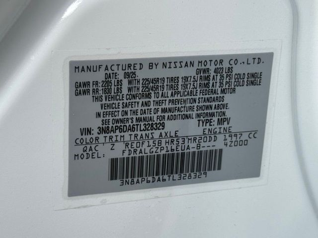 17" Alloy Wheels, 19" Alloy Wheels, 4-Wheel Disc Brakes, 6 Speakers, ABS brakes, Air Conditioning, Alloy wheels, AM/FM radio, Auto High-beam Headlights, Automatic temperature control, Brake assist, Bumpers: body-color, Carpeted Floor Mats and Underfloor Protector, Delay-off headlights, Driver door bin, Driver vanity mirror, Dual front impact airbags, Dual front side impact airbags, Electronic Stability Control, Emergency communication system: NissanConnect Services, Exterior Parking Camera Rear, Front anti-roll bar, Front Bucket Seats, Front Center Armrest, Front reading lights, Front wheel independent suspension, Fully automatic headlights, Garage door transmitter: myQ Connected Garage, Illuminated entry, Knee airbag, Leather Shift Knob, Leather steering wheel, Low tire pressure warning, NissanConnect featuring Apple CarPlay and Android Auto, Occupant sensing airbag, Outside temperature display, Overhead airbag, Overhead console, Panic alarm, Passenger door bin, Passenger vanity mirror, Power door mirrors, Power steering, Power windows, Premium Paint, Radio data system, Radio: AM/FM/SiriusXM Audio System, Rear anti-roll bar, Rear reading lights, Rear seat center armrest, Rear side impact airbag, Rear window defroster, Rear window wiper, Remote keyless entry, Security system, Speed control, Speed-sensing steering, Splash Guards, Split folding rear seat, Spoiler, Sport Leatherette with Cloth Insert Seat Trim, Sport steering wheel, Steering wheel mounted audio controls, Tachometer, Telescoping steering wheel, Tilt steering wheel, Traction control, Trip computer, Turn signal indicator mirrors, and Variably intermittent wipers. Price includes: $1500 - Nissan Customer Cash. Exp. 05/04/2026 Price includes dealer added accessories.