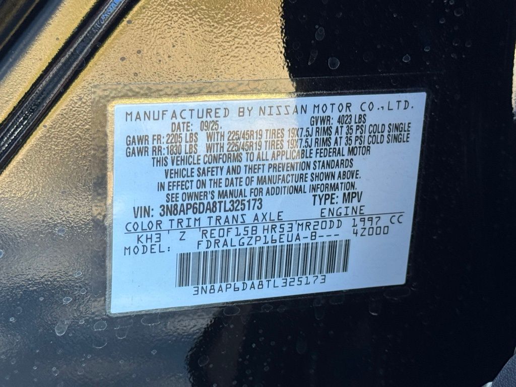 17" Alloy Wheels, 19" Alloy Wheels, 4-Wheel Disc Brakes, 6 Speakers, ABS brakes, Air Conditioning, Alloy wheels, AM/FM radio, Auto High-beam Headlights, Automatic temperature control, Brake assist, Bumpers: body-color, Delay-off headlights, Driver door bin, Driver vanity mirror, Dual front impact airbags, Dual front side impact airbags, Electronic Stability Control, Emergency communication system: NissanConnect Services, Exterior Parking Camera Rear, Front anti-roll bar, Front Bucket Seats, Front Center Armrest, Front reading lights, Front wheel independent suspension, Fully automatic headlights, Garage door transmitter: myQ Connected Garage, Illuminated entry, Knee airbag, Leather Shift Knob, Leather steering wheel, Low tire pressure warning, NissanConnect featuring Apple CarPlay and Android Auto, Occupant sensing airbag, Outside temperature display, Overhead airbag, Overhead console, Panic alarm, Passenger door bin, Passenger vanity mirror, Power door mirrors, Power steering, Power windows, Radio data system, Radio: AM/FM/SiriusXM Audio System, Rear anti-roll bar, Rear reading lights, Rear seat center armrest, Rear side impact airbag, Rear window defroster, Rear window wiper, Remote keyless entry, Security system, Speed control, Speed-sensing steering, Splash Guards, Split folding rear seat, Spoiler, Sport steering wheel, Steering wheel mounted audio controls, Tachometer, Telescoping steering wheel, Tilt steering wheel, Traction control, Trip computer, Turn signal indicator mirrors, and Variably intermittent wipers. Price includes all rebates: $1500 - Nissan Customer Cash. Exp. 05/04/2026