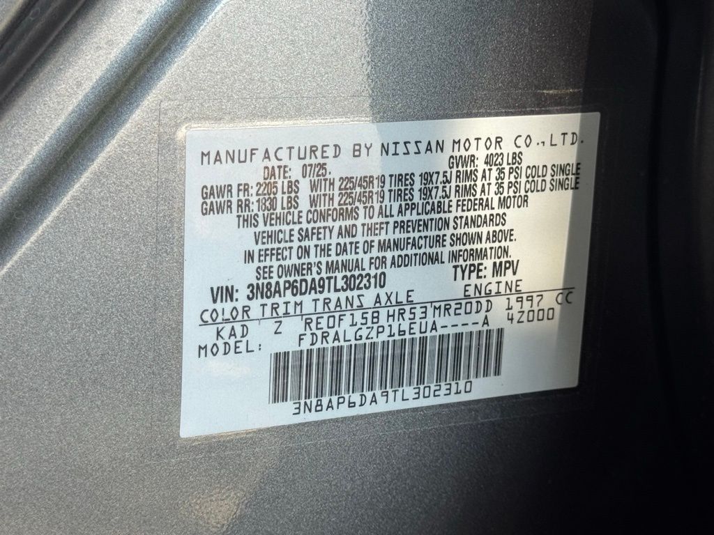 17" Alloy Wheels, 4-Wheel Disc Brakes, 6 Speakers, ABS brakes, Air Conditioning, Alloy wheels, AM/FM radio, Auto High-beam Headlights, Automatic temperature control, Brake assist, Bumpers: body-color, Crossbars, Delay-off headlights, Driver door bin, Driver vanity mirror, Dual front impact airbags, Dual front side impact airbags, Electronic Stability Control, Emergency communication system: NissanConnect Services, Exterior Parking Camera Rear, Front anti-roll bar, Front Bucket Seats, Front Center Armrest, Front reading lights, Front wheel independent suspension, Fully automatic headlights, Garage door transmitter: myQ Connected Garage, Illuminated entry, Knee airbag, Leather Shift Knob, Leather steering wheel, Low tire pressure warning, NissanConnect featuring Apple CarPlay and Android Auto, Occupant sensing airbag, Outside temperature display, Overhead airbag, Overhead console, Panic alarm, Passenger door bin, Passenger vanity mirror, Power door mirrors, Power steering, Power windows, Radio data system, Radio: AM/FM/SiriusXM Audio System, Rear anti-roll bar, Rear reading lights, Rear seat center armrest, Rear side impact airbag, Rear window defroster, Rear window wiper, Remote keyless entry, Security system, Speed control, Speed-sensing steering, Splash Guards, Split folding rear seat, Spoiler, Sport steering wheel, Steering wheel mounted audio controls, Tachometer, Telescoping steering wheel, Tilt steering wheel, Traction control, Trip computer, Turn signal indicator mirrors, Variably intermittent wipers, and Wheels: 19" Dark Gray Alloy. Price includes all rebates: $1500 - Nissan Customer Cash. Exp. 05/04/2026
