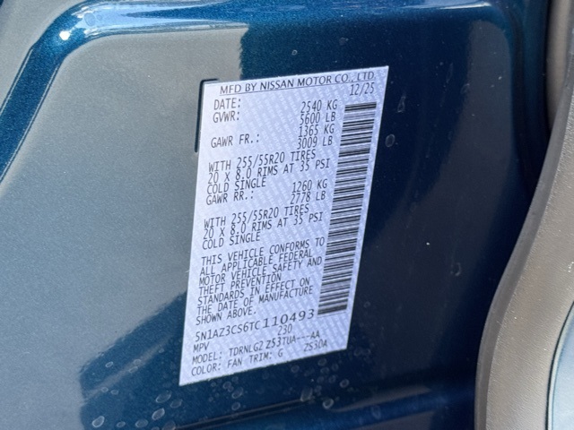 10 Speakers, 20" Alloy Wheels, 4-Wheel Disc Brakes, ABS brakes, Air Conditioning, Alloy wheels, AM/FM radio: SiriusXM w/360L, Auto High-beam Headlights, Auto-dimming Rear-View mirror, Automatic temperature control, Brake assist, Bumpers: body-color, Carpeted Floor & Cargo Mats, Child-Seat-Sensing Airbag, Compass, Delay-off headlights, Driver door bin, Driver vanity mirror, Dual front impact airbags, Dual front side impact airbags, Electronic Stability Control, Emergency communication system: NissanConnect Services, Four wheel independent suspension, Frameless Rearview Mirror w/UGDO, Front anti-roll bar, Front Bucket Seats, Front Center Armrest, Front dual zone A/C, Front reading lights, Fully automatic headlights, Garage door transmitter: myQ Connected Garage, Grained Splash Guards, Heated door mirrors, Heated Front Bucket Seats, Heated front seats, Heated steering wheel, Illuminated entry, Knee airbag, Low tire pressure warning, Memory seat, Navigation system: NissanConnect with Navigation and Services, Occupant sensing airbag, Outside temperature display, Overhead airbag, Overhead console, Panic alarm, Passenger door bin, Passenger vanity mirror, Power door mirrors, Power driver seat, Power Liftgate, Power moonroof: Panoramic, Power passenger seat, Power steering, Power windows, Premium Paint, Prima-Tex Leatherette Seat Trim w/Perforation, Radio data system, Radio: NissanConnect w/Hybrid Radio, Rear anti-roll bar, Rear reading lights, Rear seat center armrest, Rear side impact airbag, Rear window defroster, Rear window wiper, Remote keyless entry, Security system, Speed control, Speed-Sensitive Wipers, Split folding rear seat, Spoiler, Steering wheel mounted audio controls, Tachometer, Telescoping steering wheel, Tilt steering wheel, Traction control, Trip computer, Turn signal indicator mirrors, Variably intermittent wipers, Wheels: 20" Alloy (W10), and Wireless Apple CarPlay/Wireless Android Auto.