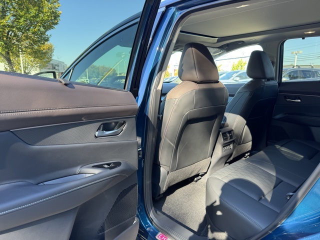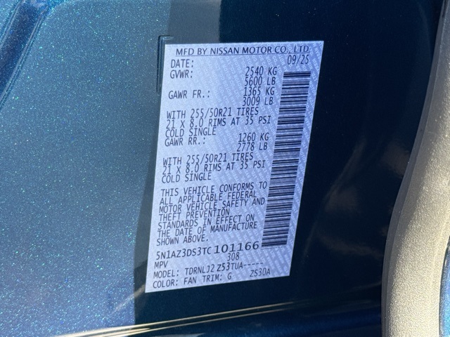 Cargo Package (3-Position Cargo Area Protector, Cargo Net, First Aid Kit, and Retractable Cargo Cover), 10 Speakers, 2-Tone w/Premium Paint, 21" Alloy Wheels, 4-Wheel Disc Brakes, ABS brakes, Air Conditioning, Alloy wheels, AM/FM radio: SiriusXM w/360L, Auto High-beam Headlights, Auto tilt-away steering wheel, Auto-dimming Rear-View mirror, Automatic temperature control, Brake assist, Bumpers: body-color, Carpeted Floor & Cargo Mats, Child-Seat-Sensing Airbag, Compass, Delay-off headlights, Driver door bin, Driver vanity mirror, Dual front impact airbags, Dual front side impact airbags, Electronic Stability Control, Emergency communication system: NissanConnect Services, Four wheel independent suspension, Front anti-roll bar, Front Bucket Seats, Front Center Armrest, Front dual zone A/C, Front reading lights, Fully automatic headlights, Garage door transmitter: HomeLink, Heads-Up Display, Heated & Ventilated Front Bucket Seats w/Massage, Heated door mirrors, Heated front seats, Heated rear seats, Heated steering wheel, Illuminated entry, Illuminated Kick Plates, Knee airbag, Low tire pressure warning, Memory seat, Navigation system: NissanConnect with Navigation and Services, Occupant sensing airbag, Outside temperature display, Overhead airbag, Overhead console, Painted Splash Guards, Panic alarm, Passenger door bin, Passenger vanity mirror, Power door mirrors, Power driver seat, Power Liftgate, Power moonroof: Panoramic, Power passenger seat, Power steering, Power windows, Quilted Semi-Aniline Leather-Appointed Seat Trim, Radio data system, Radio: NissanConnect w/Hybrid Radio, Rain sensing wipers, Rear anti-roll bar, Rear reading lights, Rear seat center armrest, Rear side impact airbag, Rear window defroster, Rear window wiper, Remote keyless entry, Security system, Speed control, Speed-Sensitive Wipers, Split folding rear seat, Spoiler, Steering wheel memory, Steering wheel mounted audio controls, Tachometer, Telescoping steering wheel, Tilt steering wheel, Traction control, Trip computer, Turn signal indicator mirrors, Variably intermittent wipers, Ventilated front seats, and Wireless Apple CarPlay/Wireless Android Auto.