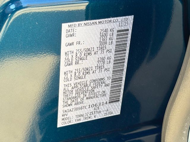 Cargo Package (3-Position Cargo Area Protector, Cargo Net, First Aid Kit, and Retractable Cargo Cover), 10 Speakers, 21" Alloy Wheels, 4-Wheel Disc Brakes, ABS brakes, Air Conditioning, Alloy wheels, AM/FM radio: SiriusXM w/360L, Auto High-beam Headlights, Auto tilt-away steering wheel, Auto-dimming Rear-View mirror, Automatic temperature control, Brake assist, Bumpers: body-color, Carpeted Floor and Cargo Mats, Child-Seat-Sensing Airbag, Compass, Delay-off headlights, Driver door bin, Driver vanity mirror, Dual front impact airbags, Dual front side impact airbags, Electronic Stability Control, Emergency communication system: NissanConnect Services, Four wheel independent suspension, Front anti-roll bar, Front Bucket Seats, Front Center Armrest, Front dual zone A/C, Front reading lights, Fully automatic headlights, Garage door transmitter: HomeLink, Heads-Up Display, Heated and Ventilated Front Bucket Seats with Massage, Heated door mirrors, Heated front seats, Heated rear seats, Heated steering wheel, Illuminated entry, Illuminated Kick Plates, Knee airbag, Low tire pressure warning, Memory seat, Navigation system: NissanConnect with Navigation and Services, Occupant sensing airbag, Outside temperature display, Overhead airbag, Overhead console, Painted Splash Guards, Panic alarm, Passenger door bin, Passenger vanity mirror, Power door mirrors, Power driver seat, Power Liftgate, Power moonroof: Panoramic, Power passenger seat, Power steering, Power windows, Premium Paint, Quilted Semi-Aniline Leather-Appointed Seat Trim, Radio data system, Radio: NissanConnect with 4 Hybrid, Rain sensing wipers, Rear anti-roll bar, Rear reading lights, Rear seat center armrest, Rear side impact airbag, Rear window defroster, Rear window wiper, Remote keyless entry, Security system, Speed control, Speed-Sensitive Wipers, Split folding rear seat, Spoiler, Steering wheel memory, Steering wheel mounted audio controls, Tachometer, Telescoping steering wheel, Tilt steering wheel, Traction control, Trip computer, Turn signal indicator mirrors, Variably intermittent wipers, Ventilated front seats, and Wireless Apple CarPlay/Wireless Android Auto. Price includes: $4000 - Nissan Customer Cash. Exp. 05/04/2026 Price includes dealer added accessories.