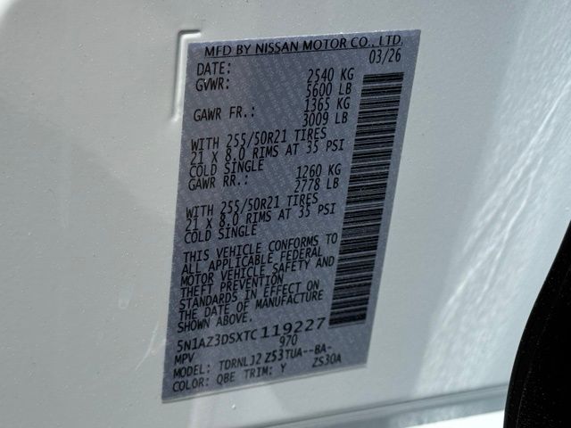 Cargo Package (3-Position Cargo Area Protector, Cargo Net, First Aid Kit, and Retractable Cargo Cover), 10 Speakers, 21" Alloy Wheels, 4-Wheel Disc Brakes, ABS brakes, Air Conditioning, Alloy wheels, AM/FM radio: SiriusXM w/360L, Auto High-beam Headlights, Auto tilt-away steering wheel, Auto-dimming Rear-View mirror, Automatic temperature control, Brake assist, Bumpers: body-color, Carpeted Floor and Cargo Mats, Child-Seat-Sensing Airbag, Compass, Delay-off headlights, Driver door bin, Driver vanity mirror, Dual front impact airbags, Dual front side impact airbags, Electronic Stability Control, Emergency communication system: NissanConnect Services, Four wheel independent suspension, Front anti-roll bar, Front Bucket Seats, Front Center Armrest, Front dual zone A/C, Front reading lights, Fully automatic headlights, Garage door transmitter: HomeLink, Heads-Up Display, Heated and Ventilated Front Bucket Seats with Massage, Heated door mirrors, Heated front seats, Heated rear seats, Heated steering wheel, Illuminated entry, Knee airbag, Low tire pressure warning, Memory seat, Navigation system: NissanConnect with Navigation and Services, Occupant sensing airbag, Outside temperature display, Overhead airbag, Overhead console, Painted Splash Guards, Panic alarm, Panoramic Headliner Illumination, Passenger door bin, Passenger vanity mirror, Power door mirrors, Power driver seat, Power Liftgate, Power moonroof: Panoramic, Power passenger seat, Power steering, Power windows, Premium Paint, Quilted Semi-Aniline Leather-Appointed Seat Trim, Radio data system, Radio: NissanConnect with 4 Hybrid, Rain sensing wipers, Rear anti-roll bar, Rear reading lights, Rear seat center armrest, Rear side impact airbag, Rear window defroster, Rear window wiper, Remote keyless entry, Security system, Speed control, Speed-Sensitive Wipers, Split folding rear seat, Spoiler, Steering wheel memory, Steering wheel mounted audio controls, Tachometer, Telescoping steering wheel, Tilt steering wheel, Traction control, Trip computer, Turn signal indicator mirrors, USB Charging Cables, Variably intermittent wipers, Ventilated front seats, and Wireless Apple CarPlay/Wireless Android Auto. Price includes: $4000 - Nissan Customer Cash. Exp. 05/04/2026 Price includes dealer added accessories.