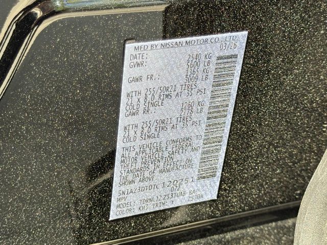 Cargo Package (3-Position Cargo Area Protector, Cargo Net, First Aid Kit, and Retractable Cargo Cover), Technology Package (3D Around View Monitor, Driver Attention Warning, Driver Distraction Warning, and ProPILOT Assist 2.1), 10 Speakers, 21" Alloy Wheels, 4-Wheel Disc Brakes, ABS brakes, Air Conditioning, Alloy wheels, AM/FM radio: SiriusXM w/360L, Auto High-beam Headlights, Auto tilt-away steering wheel, Auto-dimming Rear-View mirror, Automatic temperature control, Brake assist, Bumpers: body-color, Carpeted Floor and Cargo Mats, Child-Seat-Sensing Airbag, Compass, Delay-off headlights, Driver door bin, Driver vanity mirror, Dual front impact airbags, Dual front side impact airbags, Electronic Stability Control, Emergency communication system: NissanConnect Services, Four wheel independent suspension, Front anti-roll bar, Front Bucket Seats, Front Center Armrest, Front dual zone A/C, Front reading lights, Fully automatic headlights, Garage door transmitter: HomeLink, Heads-Up Display, Heated and Ventilated Front Bucket Seats with Massage, Heated door mirrors, Heated front seats, Heated rear seats, Heated steering wheel, Illuminated entry, Knee airbag, Low tire pressure warning, Memory seat, Navigation system: NissanConnect with Navigation and Services, Occupant sensing airbag, Outside temperature display, Overhead airbag, Overhead console, Painted Splash Guards, Panic alarm, Panoramic Headliner Illumination, Passenger door bin, Passenger vanity mirror, Power door mirrors, Power driver seat, Power Liftgate, Power moonroof: Panoramic, Power passenger seat, Power steering, Power windows, Quilted Semi-Aniline Leather-Appointed Seat Trim, Radio data system, Radio: NissanConnect with 4 Hybrid, Rain sensing wipers, Rear anti-roll bar, Rear reading lights, Rear seat center armrest, Rear side impact airbag, Rear window defroster, Rear window wiper, Remote keyless entry, Security system, Speed control, Speed-Sensitive Wipers, Split folding rear seat, Spoiler, Steering wheel memory, Steering wheel mounted audio controls, Tachometer, Telescoping steering wheel, Tilt steering wheel, Traction control, Trip computer, Turn signal indicator mirrors, USB Charging Cables, Variably intermittent wipers, Ventilated front seats, and Wireless Apple CarPlay/Wireless Android Auto. Price includes: $4000 - Nissan Customer Cash. Exp. 05/04/2026 Price includes dealer added accessories.