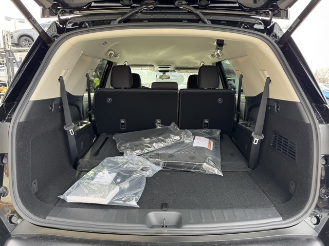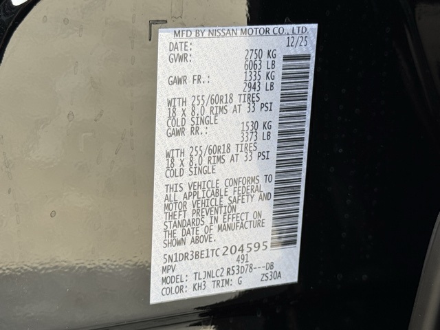 18" Painted Alloy Wheels, 3rd row seats: bench, 4-Piece Black Splash Guards, 4-Wheel Disc Brakes, 6 Speakers, ABS brakes, Air Conditioning, Alloy wheels, AM/FM radio: SiriusXM w/360L, Auto High-beam Headlights, Automatic temperature control, Bench Seat Carpeted Floor Mats, Brake assist, Bumpers: body-color, Cloth Seating Surfaces, Cross Bars, Delay-off headlights, Driver door bin, Driver vanity mirror, Dual front impact airbags, Dual front side impact airbags, Electronic Stability Control, Emergency communication system: NissanConnect Services, Four wheel independent suspension, Front anti-roll bar, Front Bucket Seats, Front Center Armrest, Front dual zone A/C, Front reading lights, Fully automatic headlights, Garage door transmitter: myQ Connected Garage, Heated door mirrors, Heated Front Bucket Seats, Heated front seats, Illuminated entry, Knee airbag, Low tire pressure warning, NissanConnect featuring Apple CarPlay and Android Auto, Occupant sensing airbag, Outside temperature display, Overhead airbag, Overhead console, Panic alarm, Passenger door bin, Passenger vanity mirror, Power door mirrors, Power driver seat, Power Liftgate, Power steering, Power windows, Radio data system, Radio: AM/FM Audio System with NissanConnect, Rear air conditioning, Rear anti-roll bar, Rear reading lights, Rear seat center armrest, Rear side impact airbag, Rear window defroster, Rear window wiper, Reclining 3rd row seat, Remote keyless entry, Security system, Speed control, Speed-sensing steering, Split folding rear seat, Spoiler, Steering wheel mounted audio controls, Tachometer, Telescoping steering wheel, Tilt steering wheel, Traction control, Trip computer, and Variably intermittent wipers. Price includes: $2000 - Nissan Customer Cash. Exp. 03/02/2026 Price includes dealer added accessories.
