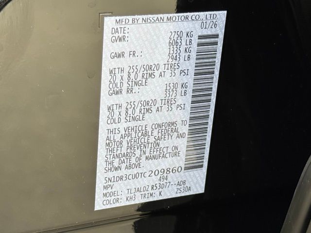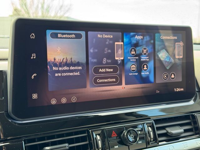SL Premium Package (2nd Row Manual Sunshades, Bose Premium Audio System, Heated Rear Seats, Panoramic Moonroof, Tow Hitch Receiver and Harness, and Wheels: 20" Machined Alloy with Dark Metallic Gray Finish), 18" Machined Alloy Wheels, 2nd-Row Captain Chairs, 3rd row seats: bench, 4-Piece Black Splash Guards, 4-Wheel Disc Brakes, 6 Speakers, ABS brakes, Air Conditioning, Alloy wheels, AM/FM radio: SiriusXM w/360L, Auto High-beam Headlights, Auto-dimming Rear-View mirror, Automatic temperature control, Brake assist, Bumpers: body-color, Captain's Chairs Carpeted Floor Mats, Cross Bars, Delay-off headlights, Driver door bin, Driver vanity mirror, Dual front impact airbags, Dual front side impact airbags, Electronic Stability Control, Emergency communication system: NissanConnect Services, Four wheel independent suspension, Front anti-roll bar, Front Bucket Seats, Front Center Armrest, Front dual zone A/C, Front reading lights, Fully automatic headlights, Garage door transmitter: HomeLink, Heated door mirrors, Heated Front Bucket Seats, Heated front seats, Heated steering wheel, Illuminated entry, Knee airbag, Low tire pressure warning, NissanConnect featuring Apple CarPlay and Android Auto, Occupant sensing airbag, Outside temperature display, Overhead airbag, Overhead console, Panic alarm, Passenger door bin, Passenger vanity mirror, Power door mirrors, Power driver seat, Power Liftgate, Power steering, Power windows, Radio data system, Radio: AM/FM Audio System with NissanConnect, Rear air conditioning, Rear anti-roll bar, Rear reading lights, Rear seat center armrest, Rear side impact airbag, Rear window defroster, Rear window wiper, Reclining 3rd row seat, Remote keyless entry, Removable Center Console, Security system, Speed control, Speed-sensing steering, Split folding rear seat, Spoiler, Steering wheel mounted audio controls, Tachometer, TailorFit Appointed Seating Surfaces, Telescoping steering wheel, Tilt steering wheel, Traction control, Trip computer, Turn signal indicator mirrors, and Variably intermittent wipers. Price includes: $3500 - Nissan Customer Cash. Exp. 05/04/2026 Price includes dealer added accessories.