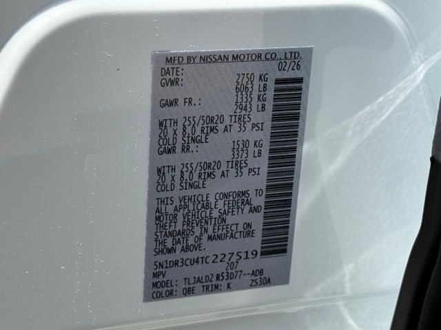 Accent Package (Illuminated Cargo Scuff Plates and Panoramic Headliner Illumination), SL Premium Package (2nd Row Manual Sunshades, Bose Premium Audio System, Heated Rear Seats, Panoramic Moonroof, Tow Hitch Receiver and Harness, and Wheels: 20" Machined Alloy with Dark Metallic Gray Finish), 18" Machined Alloy Wheels, 2nd-Row Captain Chairs, 3rd row seats: bench, 4-Piece Black Splash Guards, 4-Wheel Disc Brakes, 6 Speakers, ABS brakes, Air Conditioning, Alloy wheels, AM/FM radio: SiriusXM w/360L, Auto High-beam Headlights, Auto-dimming Rear-View mirror, Automatic temperature control, Brake assist, Bumpers: body-color, Captain's Chairs Carpeted Floor Mats, Cross Bars, Delay-off headlights, Driver door bin, Driver vanity mirror, Dual front impact airbags, Dual front side impact airbags, Electronic Stability Control, Emergency communication system: NissanConnect Services, Four wheel independent suspension, Front anti-roll bar, Front Bucket Seats, Front Center Armrest, Front dual zone A/C, Front reading lights, Fully automatic headlights, Garage door transmitter: HomeLink, Heated door mirrors, Heated Front Bucket Seats, Heated front seats, Heated steering wheel, Illuminated entry, Knee airbag, Low tire pressure warning, NissanConnect featuring Apple CarPlay and Android Auto, Occupant sensing airbag, Outside temperature display, Overhead airbag, Overhead console, Panic alarm, Passenger door bin, Passenger vanity mirror, Power door mirrors, Power driver seat, Power Liftgate, Power steering, Power windows, Premium Paint, Radio data system, Radio: AM/FM Audio System with NissanConnect, Rear air conditioning, Rear anti-roll bar, Rear reading lights, Rear seat center armrest, Rear side impact airbag, Rear window defroster, Rear window wiper, Reclining 3rd row seat, Remote keyless entry, Removable Center Console, Security system, Speed control, Speed-sensing steering, Split folding rear seat, Spoiler, Steering wheel mounted audio controls, Tachometer, TailorFit Appointed Seating Surfaces, Telescoping steering wheel, Tilt steering wheel, Traction control, Trip computer, Turn signal indicator mirrors, and Variably intermittent wipers. Price includes: $3500 - Nissan Customer Cash. Exp. 05/04/2026 Price includes dealer added accessories.