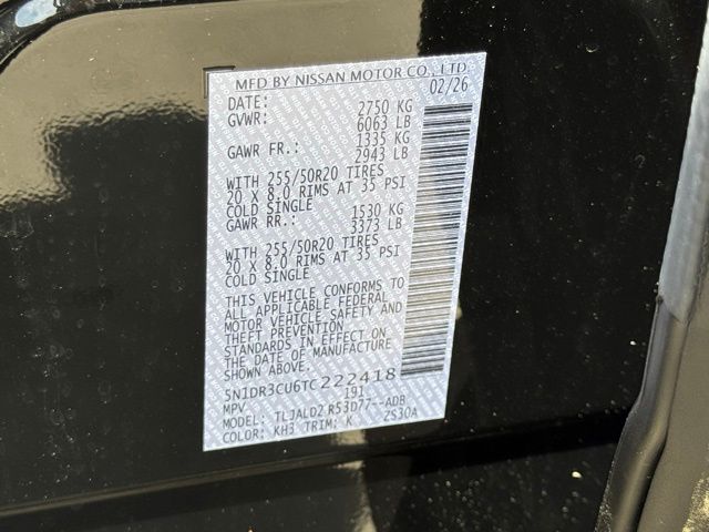 Accent Package (Illuminated Cargo Scuff Plates and Panoramic Headliner Illumination), SL Premium Package (2nd Row Manual Sunshades, Bose Premium Audio System, Heated Rear Seats, Panoramic Moonroof, Tow Hitch Receiver and Harness, and Wheels: 20" Machined Alloy with Dark Metallic Gray Finish), 18" Machined Alloy Wheels, 2nd-Row Captain Chairs, 3rd row seats: bench, 4-Piece Black Splash Guards, 4-Wheel Disc Brakes, 6 Speakers, ABS brakes, Air Conditioning, Alloy wheels, AM/FM radio: SiriusXM w/360L, Auto High-beam Headlights, Auto-dimming Rear-View mirror, Automatic temperature control, Brake assist, Bumpers: body-color, Captain's Chairs Carpeted Floor Mats, Cross Bars, Delay-off headlights, Driver door bin, Driver vanity mirror, Dual front impact airbags, Dual front side impact airbags, Electronic Stability Control, Emergency communication system: NissanConnect Services, Four wheel independent suspension, Front anti-roll bar, Front Bucket Seats, Front Center Armrest, Front dual zone A/C, Front reading lights, Fully automatic headlights, Garage door transmitter: HomeLink, Heated door mirrors, Heated Front Bucket Seats, Heated front seats, Heated steering wheel, Illuminated entry, Knee airbag, Low tire pressure warning, NissanConnect featuring Apple CarPlay and Android Auto, Occupant sensing airbag, Outside temperature display, Overhead airbag, Overhead console, Panic alarm, Passenger door bin, Passenger vanity mirror, Power door mirrors, Power driver seat, Power Liftgate, Power steering, Power windows, Radio data system, Radio: AM/FM Audio System with NissanConnect, Rear air conditioning, Rear anti-roll bar, Rear reading lights, Rear seat center armrest, Rear side impact airbag, Rear window defroster, Rear window wiper, Reclining 3rd row seat, Remote keyless entry, Removable Center Console, Security system, Speed control, Speed-sensing steering, Split folding rear seat, Spoiler, Steering wheel mounted audio controls, Tachometer, TailorFit Appointed Seating Surfaces, Telescoping steering wheel, Tilt steering wheel, Traction control, Trip computer, Turn signal indicator mirrors, and Variably intermittent wipers. Price includes: $3500 - Nissan Customer Cash. Exp. 05/04/2026 Price includes dealer added accessories.