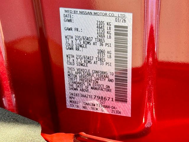 17" Alloy Wheels, 4 Speakers, 4-Wheel Disc Brakes, ABS brakes, Air Conditioning, Alloy wheels, AM/FM radio, Apple CarPlay/Android Auto, Auto High-beam Headlights, Black Splash Guards (set of 4), Blind Spot Warning, Brake assist, Bumpers: body-color, Cloth Seat Trim, Delay-off headlights, Driver door bin, Driver vanity mirror, Dual front impact airbags, Dual front side impact airbags, Electronic Stability Control, First Aid Kit, Floor Mats with 1-Piece Cargo Area Protector, Four wheel independent suspension, Front anti-roll bar, Front Bucket Seats, Front Center Armrest, Front reading lights, Fully automatic headlights, Illuminated entry, Knee airbag, Low tire pressure warning, Occupant sensing airbag, Outside temperature display, Overhead airbag, Overhead console, Panic alarm, Passenger door bin, Passenger vanity mirror, Power door mirrors, Power steering, Power windows, Premium Paint, Radio data system, Radio: AM/FM NissanConnect, Rear anti-roll bar, Rear seat center armrest, Rear side impact airbag, Rear window defroster, Rear window wiper, Remote keyless entry, Speed control, Speed-sensing steering, Speed-Sensitive Wipers, Split folding rear seat, Spoiler, Steering wheel mounted audio controls, Tachometer, Telescoping steering wheel, Tilt steering wheel, Traction control, Trip computer, USB Charging Cable Set, and Variably intermittent wipers. Price includes: $3500 - Nissan Customer Cash. Exp. 05/04/2026 Price includes dealer added accessories.