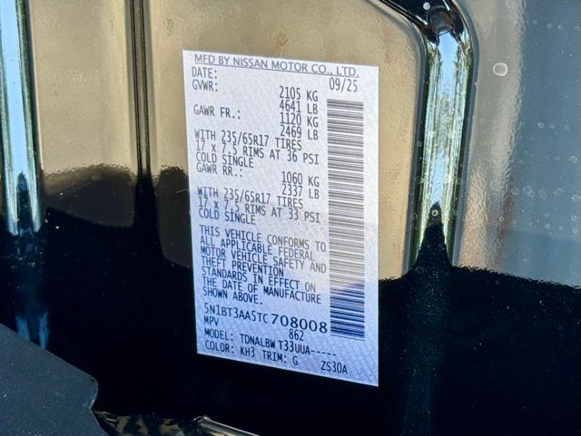 17" Alloy Wheels, 4 Speakers, 4-Wheel Disc Brakes, ABS brakes, Air Conditioning, Alloy wheels, AM/FM radio: Sirius, Apple CarPlay/Android Auto, Auto High-beam Headlights, Black Splash Guards (set of 4), Blind Spot Warning, Brake assist, Bumpers: body-color, Cloth Seat Trim, Delay-off headlights, Driver door bin, Driver vanity mirror, Dual front impact airbags, Dual front side impact airbags, Electronic Stability Control, First Aid Kit, Floor Mats with 1-Piece Cargo Area Protector, Four wheel independent suspension, Front anti-roll bar, Front Bucket Seats, Front Center Armrest, Front reading lights, Fully automatic headlights, Illuminated entry, Knee airbag, Low tire pressure warning, Occupant sensing airbag, Outside temperature display, Overhead airbag, Overhead console, Panic alarm, Passenger door bin, Passenger vanity mirror, Power door mirrors, Power steering, Power windows, Radio data system, Radio: AM/FM NissanConnect, Rear anti-roll bar, Rear seat center armrest, Rear side impact airbag, Rear window defroster, Rear window wiper, Remote keyless entry, Speed control, Speed-sensing steering, Speed-Sensitive Wipers, Split folding rear seat, Spoiler, Steering wheel mounted audio controls, Tachometer, Telescoping steering wheel, Tilt steering wheel, Traction control, Trip computer, and Variably intermittent wipers. Price includes: $3500 - Nissan Customer Cash. Exp. 05/04/2026 Price includes dealer added accessories.