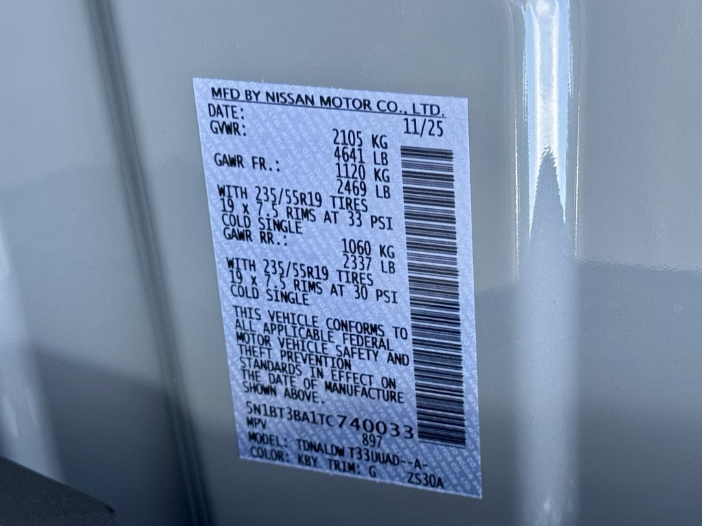 4-Wheel Disc Brakes, 6 Speakers, ABS brakes, Air Conditioning, Alloy wheels, AM/FM radio, Apple CarPlay/Android Auto, Auto High-beam Headlights, Automatic temperature control, Black Splash Guards (set of 4), Brake assist, Bumpers: body-color, Delay-off headlights, Driver door bin, Driver vanity mirror, Dual front impact airbags, Dual front side impact airbags, Electronic Stability Control, Emergency communication system: NissanConnect Services, Exterior Parking Camera Rear, Floor Mats with 1-Piece Cargo Area Protector, Four wheel independent suspension, Front anti-roll bar, Front Bucket Seats, Front Center Armrest, Front dual zone A/C, Front reading lights, Fully automatic headlights, Heated door mirrors, Heated Front Bucket Seats, Heated front seats, Heated steering wheel, Illuminated entry, Illuminated Kick Plates, Knee airbag, Low tire pressure warning, Occupant sensing airbag, Outside temperature display, Overhead airbag, Overhead console, Panic alarm, Passenger door bin, Passenger vanity mirror, Power door mirrors, Power driver seat, Power Liftgate, Power moonroof, Power steering, Power windows, Premium Paint, Prima-Tex Leatherette Seat Trim, Radio data system, Radio: AM/FM NissanConnect, Rear anti-roll bar, Rear Parking Sensors, Rear reading lights, Rear seat center armrest, Rear side impact airbag, Rear window defroster, Rear window wiper, Remote keyless entry, Speed control, Speed-sensing steering, Speed-Sensitive Wipers, Split folding rear seat, Spoiler, Steering wheel mounted audio controls, Tachometer, Telescoping steering wheel, Tilt steering wheel, Traction control, Trip computer, Variably intermittent wipers, and Wheels: 19" Black Painted and Machine Finished Alloy. Price includes all rebates: $3500 - Nissan Customer Cash. Exp. 03/02/2026