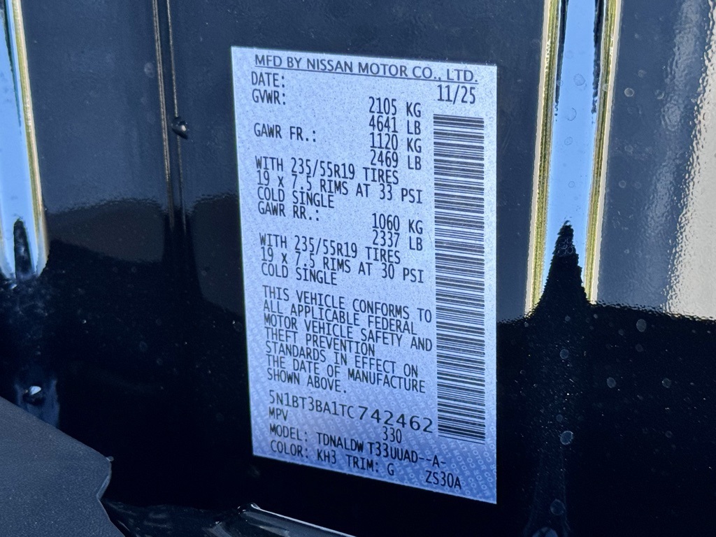 4-Wheel Disc Brakes, 6 Speakers, ABS brakes, Air Conditioning, Alloy wheels, AM/FM radio, Apple CarPlay/Android Auto, Auto High-beam Headlights, Automatic temperature control, Black Splash Guards (set of 4), Brake assist, Bumpers: body-color, Delay-off headlights, Driver door bin, Driver vanity mirror, Dual front impact airbags, Dual front side impact airbags, Electronic Stability Control, Emergency communication system: NissanConnect Services, Exterior Parking Camera Rear, Floor Mats with 1-Piece Cargo Area Protector, Four wheel independent suspension, Frameless Rearview Mirror with Universal Remote, Front anti-roll bar, Front Bucket Seats, Front Center Armrest, Front dual zone A/C, Front reading lights, Fully automatic headlights, Heated door mirrors, Heated Front Bucket Seats, Heated front seats, Heated steering wheel, Illuminated entry, Illuminated Kick Plates, Knee airbag, Low tire pressure warning, Occupant sensing airbag, Outside temperature display, Overhead airbag, Overhead console, Panic alarm, Passenger door bin, Passenger vanity mirror, Power door mirrors, Power driver seat, Power Liftgate, Power moonroof, Power steering, Power windows, Prima-Tex Leatherette Seat Trim, Radio data system, Radio: AM/FM NissanConnect, Rear anti-roll bar, Rear Parking Sensors, Rear reading lights, Rear seat center armrest, Rear side impact airbag, Rear window defroster, Rear window wiper, Remote keyless entry, Retractable Cargo Cover, Speed control, Speed-sensing steering, Speed-Sensitive Wipers, Split folding rear seat, Spoiler, Steering wheel mounted audio controls, Tachometer, Telescoping steering wheel, Tilt steering wheel, Traction control, Trip computer, USB Charging Cable Set, Variably intermittent wipers, and Wheels: 19" Black Painted and Machine Finished Alloy. Price includes all rebates: $3500 - Nissan Customer Cash. Exp. 03/02/2026