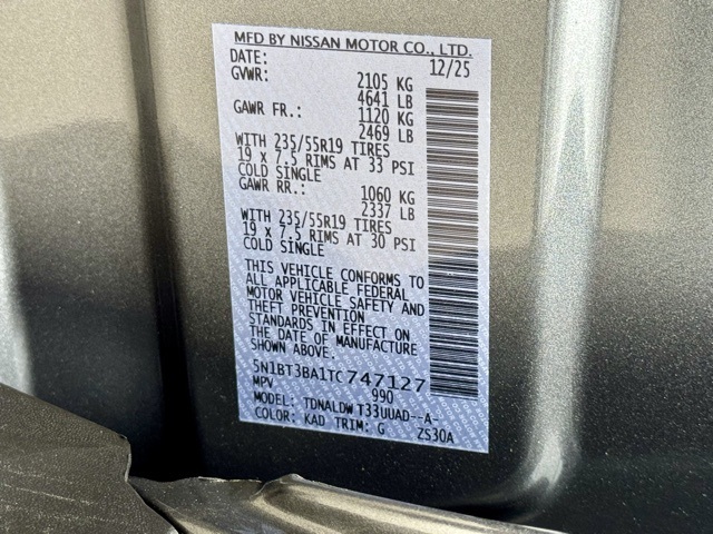 4-Wheel Disc Brakes, 6 Speakers, ABS brakes, Air Conditioning, Alloy wheels, AM/FM radio, Apple CarPlay/Android Auto, Auto High-beam Headlights, Automatic temperature control, Brake assist, Bumpers: body-color, Delay-off headlights, Driver door bin, Driver vanity mirror, Dual front impact airbags, Dual front side impact airbags, Electronic Stability Control, Emergency communication system: NissanConnect Services, Four wheel independent suspension, Front anti-roll bar, Front Bucket Seats, Front Center Armrest, Front dual zone A/C, Front reading lights, Fully automatic headlights, Heated door mirrors, Illuminated entry, Knee airbag, Low tire pressure warning, Occupant sensing airbag, Outside temperature display, Overhead airbag, Overhead console, Panic alarm, Passenger door bin, Passenger vanity mirror, Power door mirrors, Power driver seat, Power Liftgate, Power steering, Power windows, Prima-Tex Leatherette Seat Trim, Radio data system, Radio: AM/FM NissanConnect, Rear anti-roll bar, Rear seat center armrest, Rear side impact airbag, Rear window defroster, Rear window wiper, Remote keyless entry, Speed control, Speed-sensing steering, Speed-Sensitive Wipers, Split folding rear seat, Spoiler, Steering wheel mounted audio controls, Tachometer, Telescoping steering wheel, Tilt steering wheel, Traction control, Trip computer, USB Charging Cable Set, and Variably intermittent wipers. Price includes: $3500 - Nissan Customer Cash. Exp. 03/02/2026 Price includes dealer added accessories.