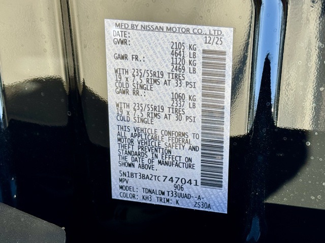 4-Wheel Disc Brakes, 6 Speakers, ABS brakes, Air Conditioning, Alloy wheels, AM/FM radio, Apple CarPlay/Android Auto, Auto High-beam Headlights, Automatic temperature control, Brake assist, Bumpers: body-color, Delay-off headlights, Driver door bin, Driver vanity mirror, Dual front impact airbags, Dual front side impact airbags, Electronic Stability Control, Emergency communication system: NissanConnect Services, Four wheel independent suspension, Frameless Rearview Mirror with Universal Remote, Front anti-roll bar, Front Bucket Seats, Front Center Armrest, Front dual zone A/C, Front reading lights, Fully automatic headlights, Heated door mirrors, Illuminated entry, Knee airbag, Low tire pressure warning, Occupant sensing airbag, Outside temperature display, Overhead airbag, Overhead console, Panic alarm, Passenger door bin, Passenger vanity mirror, Power door mirrors, Power driver seat, Power Liftgate, Power steering, Power windows, Prima-Tex Leatherette Seat Trim, Radio data system, Radio: AM/FM NissanConnect, Rear anti-roll bar, Rear seat center armrest, Rear side impact airbag, Rear window defroster, Rear window wiper, Remote keyless entry, Retractable Cargo Cover, Speed control, Speed-sensing steering, Speed-Sensitive Wipers, Split folding rear seat, Spoiler, Steering wheel mounted audio controls, Tachometer, Telescoping steering wheel, Tilt steering wheel, Traction control, Trip computer, USB Charging Cable Set, and Variably intermittent wipers. Price includes: $3500 - Nissan Customer Cash. Exp. 03/02/2026 Price includes dealer added accessories.