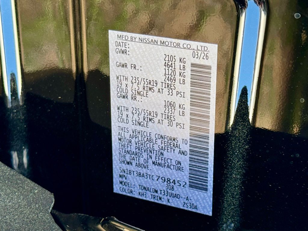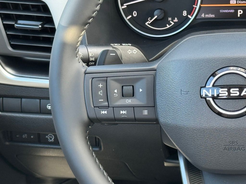 4-Wheel Disc Brakes, 6 Speakers, ABS brakes, Air Conditioning, Alloy wheels, AM/FM radio, Apple CarPlay/Android Auto, Auto High-beam Headlights, Automatic temperature control, Black Splash Guards (set of 4), Brake assist, Bumpers: body-color, Delay-off headlights, Driver door bin, Driver vanity mirror, Dual front impact airbags, Dual front side impact airbags, Electronic Stability Control, Emergency communication system: NissanConnect Services, Exterior Parking Camera Rear, First Aid Kit, Floor Mats with 1-Piece Cargo Area Protector, Four wheel independent suspension, Frameless Rearview Mirror with Universal Remote, Front anti-roll bar, Front Bucket Seats, Front Center Armrest, Front dual zone A/C, Front reading lights, Fully automatic headlights, Heated door mirrors, Heated Front Bucket Seats, Heated front seats, Heated steering wheel, Illuminated entry, Illuminated Kick Plates, Knee airbag, Low tire pressure warning, Occupant sensing airbag, Outside temperature display, Overhead airbag, Overhead console, Panic alarm, Passenger door bin, Passenger vanity mirror, Power door mirrors, Power driver seat, Power Liftgate, Power moonroof, Power steering, Power windows, Prima-Tex Leatherette Seat Trim, Radio data system, Radio: AM/FM NissanConnect, Rear anti-roll bar, Rear Parking Sensors, Rear reading lights, Rear seat center armrest, Rear side impact airbag, Rear window defroster, Rear window wiper, Remote keyless entry, Retractable Cargo Cover, Speed control, Speed-sensing steering, Speed-Sensitive Wipers, Split folding rear seat, Spoiler, Steering wheel mounted audio controls, Tachometer, Telescoping steering wheel, Tilt steering wheel, Traction control, Trip computer, USB Charging Cable Set, Variably intermittent wipers, and Wheels: 19" Black Painted and Machine Finished Alloy. Price includes all rebates: $3500 - Nissan Customer Cash. Exp. 05/04/2026