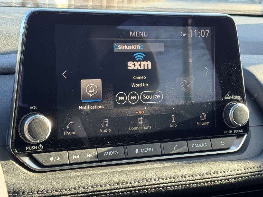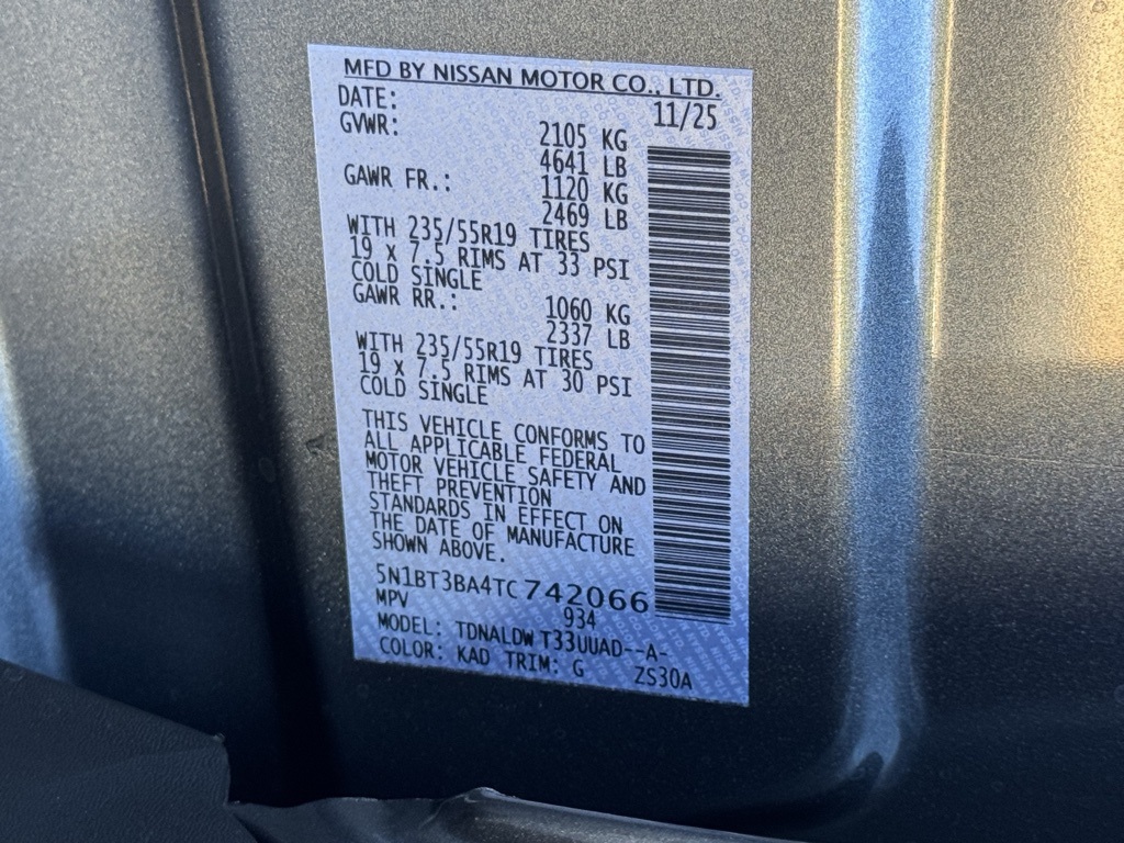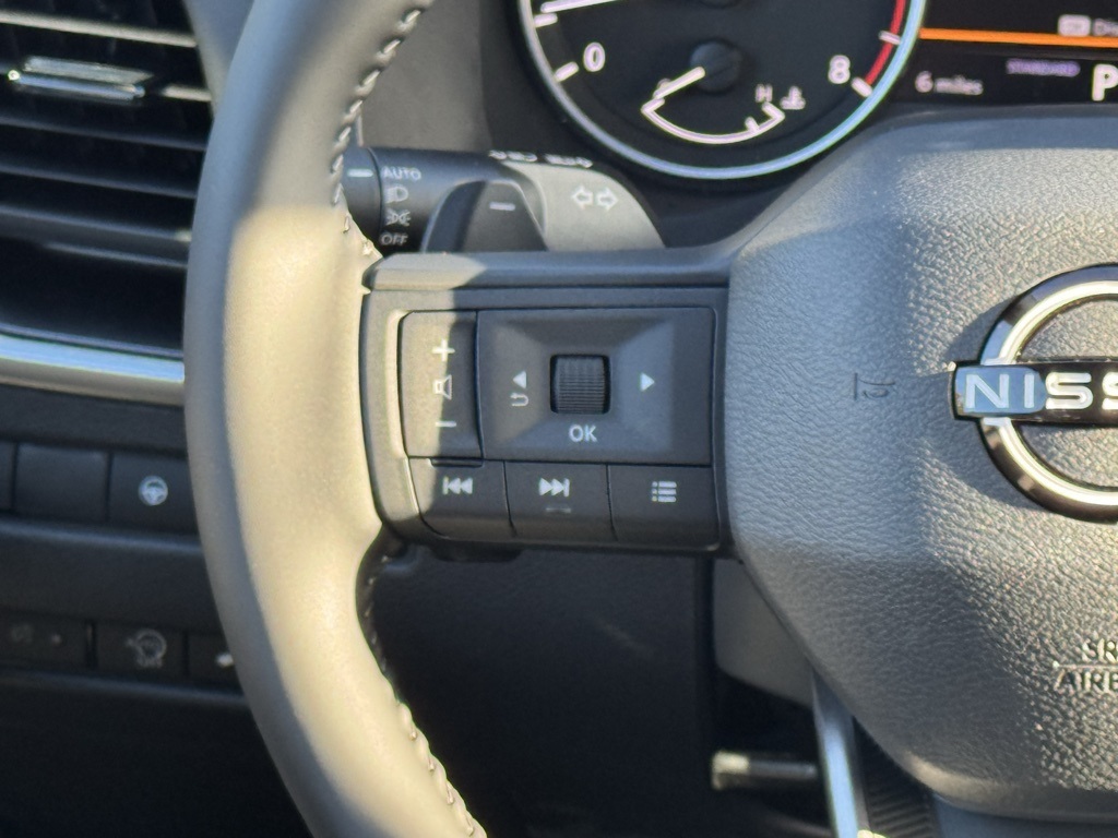 4-Wheel Disc Brakes, 6 Speakers, ABS brakes, Air Conditioning, Alloy wheels, AM/FM radio, Apple CarPlay/Android Auto, Auto High-beam Headlights, Automatic temperature control, Black Splash Guards (set of 4), Brake assist, Bumpers: body-color, Delay-off headlights, Driver door bin, Driver vanity mirror, Dual front impact airbags, Dual front side impact airbags, Electronic Stability Control, Emergency communication system: NissanConnect Services, Exterior Parking Camera Rear, Floor Mats with 1-Piece Cargo Area Protector, Four wheel independent suspension, Front anti-roll bar, Front Bucket Seats, Front Center Armrest, Front dual zone A/C, Front reading lights, Fully automatic headlights, Heated door mirrors, Heated Front Bucket Seats, Heated front seats, Heated steering wheel, Illuminated entry, Illuminated Kick Plates, Knee airbag, Low tire pressure warning, Occupant sensing airbag, Outside temperature display, Overhead airbag, Overhead console, Panic alarm, Passenger door bin, Passenger vanity mirror, Power door mirrors, Power driver seat, Power Liftgate, Power moonroof, Power steering, Power windows, Prima-Tex Leatherette Seat Trim, Radio data system, Radio: AM/FM NissanConnect, Rear anti-roll bar, Rear Parking Sensors, Rear reading lights, Rear seat center armrest, Rear side impact airbag, Rear window defroster, Rear window wiper, Remote keyless entry, Speed control, Speed-sensing steering, Speed-Sensitive Wipers, Split folding rear seat, Spoiler, Steering wheel mounted audio controls, Tachometer, Telescoping steering wheel, Tilt steering wheel, Traction control, Trip computer, Variably intermittent wipers, and Wheels: 19" Black Painted and Machine Finished Alloy.