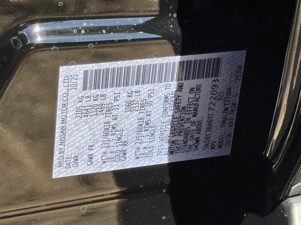 4-Wheel Disc Brakes, 6 Speakers, ABS brakes, Air Conditioning, Alloy wheels, AM/FM radio: Sirius, Apple CarPlay/Android Auto, Auto High-beam Headlights, Automatic temperature control, Black Splash Guards (Set of 4) (B92), Brake assist, Bumpers: body-color, Chrome Rear Bumper Protector, Cloth Seat Trim w/Patterned Inserts, Delay-off headlights, Driver door bin, Driver vanity mirror, Dual front impact airbags, Dual front side impact airbags, Electronic Stability Control, Emergency communication system: NissanConnect Services, First Aid Kit, Floor Mats w/1-Piece Cargo Area Protector, Four wheel independent suspension, Frameless Rearview Mirror w/Universal Remote, Front anti-roll bar, Front Bucket Seats, Front Center Armrest, Front dual zone A/C, Front reading lights, Fully automatic headlights, Heated door mirrors, Illuminated entry, Knee airbag, Low tire pressure warning, Occupant sensing airbag, Outside temperature display, Overhead airbag, Overhead console, Panic alarm, Passenger door bin, Passenger vanity mirror, Power door mirrors, Power driver seat, Power Liftgate, Power steering, Power windows, Radio data system, Radio: AM/FM NissanConnect, Rear anti-roll bar, Rear seat center armrest, Rear side impact airbag, Rear window defroster, Rear window wiper, Remote keyless entry, Retractable Cargo Cover, Speed control, Speed-sensing steering, Speed-Sensitive Wipers, Split folding rear seat, Spoiler, Steering wheel mounted audio controls, Tachometer, Telescoping steering wheel, Tilt steering wheel, Traction control, Trip computer, Variably intermittent wipers, and Wheels: 18" Dark Painted Machine Finished Alloy. Price includes all rebates: $1500 - Nissan Customer Cash. Exp. 12/01/2025