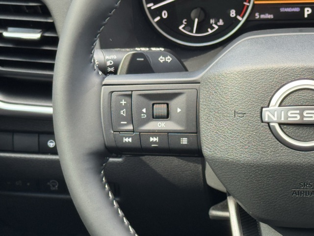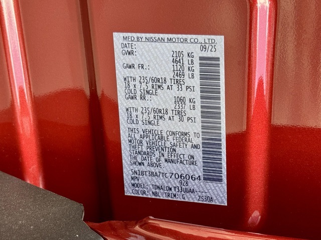 Cold Weather Package (Heated Front Seats and Heated Steering Wheel), SV Premium Package (Leatherette Door Trim Inserts w/Stitch, Panoramic Moonroof, Prima-Tex Leatherette Seat Trim, Rear Door Sunshades, Rear Personal Lights, and Silver Painted Roof Rails), 4-Wheel Disc Brakes, 6 Speakers, ABS brakes, Air Conditioning, Alloy wheels, AM/FM radio: Sirius, Apple CarPlay/Android Auto, Auto High-beam Headlights, Automatic temperature control, Black Splash Guards (Set of 4) (B92), Brake assist, Bumpers: body-color, Chrome Rear Bumper Protector, Cloth Seat Trim w/Patterned Inserts, Delay-off headlights, Driver door bin, Driver vanity mirror, Dual front impact airbags, Dual front side impact airbags, Electronic Stability Control, Emergency communication system: NissanConnect Services, First Aid Kit, Floor Mats w/1-Piece Cargo Area Protector, Four wheel independent suspension, Front anti-roll bar, Front Bucket Seats, Front Center Armrest, Front dual zone A/C, Front reading lights, Fully automatic headlights, Heated door mirrors, Illuminated entry, Knee airbag, Low tire pressure warning, Occupant sensing airbag, Outside temperature display, Overhead airbag, Overhead console, Panic alarm, Passenger door bin, Passenger vanity mirror, Power door mirrors, Power driver seat, Power Liftgate, Power steering, Power windows, Premium Paint, Radio data system, Radio: AM/FM NissanConnect, Rear anti-roll bar, Rear seat center armrest, Rear side impact airbag, Rear window defroster, Rear window wiper, Remote keyless entry, Speed control, Speed-sensing steering, Speed-Sensitive Wipers, Split folding rear seat, Spoiler, Steering wheel mounted audio controls, Tachometer, Telescoping steering wheel, Tilt steering wheel, Traction control, Trip computer, Variably intermittent wipers, and Wheels: 18" Dark Painted Machine Finished Alloy.