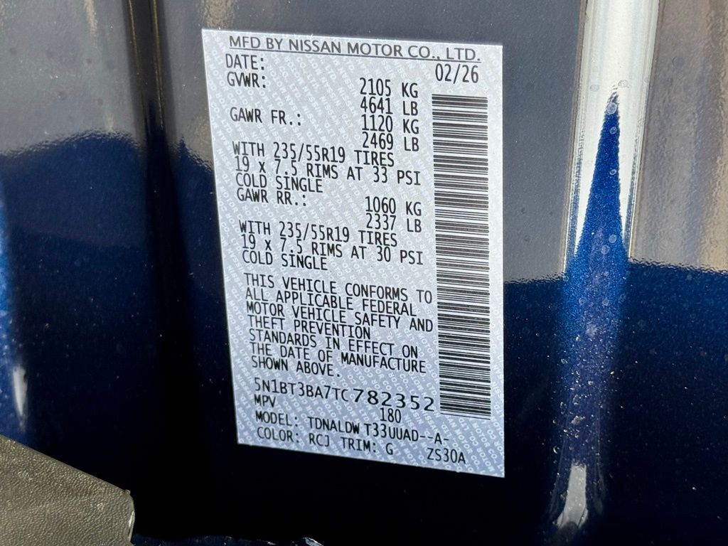 4-Wheel Disc Brakes, 6 Speakers, ABS brakes, Air Conditioning, Alloy wheels, AM/FM radio, Apple CarPlay/Android Auto, Auto High-beam Headlights, Automatic temperature control, Black Splash Guards (set of 4), Brake assist, Bumpers: body-color, Delay-off headlights, Driver door bin, Driver vanity mirror, Dual front impact airbags, Dual front side impact airbags, Electronic Stability Control, Emergency communication system: NissanConnect Services, Exterior Parking Camera Rear, Floor Mats with 1-Piece Cargo Area Protector, Four wheel independent suspension, Frameless Rearview Mirror with Universal Remote, Front anti-roll bar, Front Bucket Seats, Front Center Armrest, Front dual zone A/C, Front reading lights, Fully automatic headlights, Heated door mirrors, Heated Front Bucket Seats, Heated front seats, Heated steering wheel, Illuminated entry, Illuminated Kick Plates, Knee airbag, Low tire pressure warning, Occupant sensing airbag, Outside temperature display, Overhead airbag, Overhead console, Panic alarm, Passenger door bin, Passenger vanity mirror, Power door mirrors, Power driver seat, Power Liftgate, Power moonroof, Power steering, Power windows, Prima-Tex Leatherette Seat Trim, Radio data system, Radio: AM/FM NissanConnect, Rear anti-roll bar, Rear Parking Sensors, Rear reading lights, Rear seat center armrest, Rear side impact airbag, Rear window defroster, Rear window wiper, Remote keyless entry, Retractable Cargo Cover, Speed control, Speed-sensing steering, Speed-Sensitive Wipers, Split folding rear seat, Spoiler, Steering wheel mounted audio controls, Tachometer, Telescoping steering wheel, Tilt steering wheel, Traction control, Trip computer, Variably intermittent wipers, and Wheels: 19" Black Painted and Machine Finished Alloy. Price includes all rebates: $3500 - Nissan Customer Cash. Exp. 05/04/2026