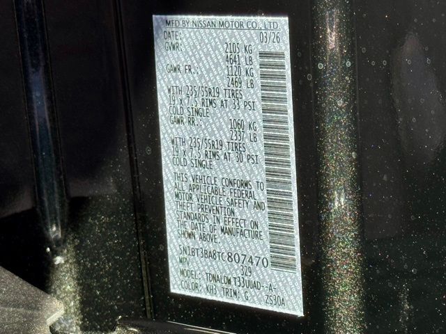 4-Wheel Disc Brakes, 6 Speakers, ABS brakes, Air Conditioning, Alloy wheels, AM/FM radio, Apple CarPlay/Android Auto, Auto High-beam Headlights, Automatic temperature control, Black Splash Guards (set of 4), Brake assist, Bumpers: body-color, Delay-off headlights, Driver door bin, Driver vanity mirror, Dual front impact airbags, Dual front side impact airbags, Electronic Stability Control, Emergency communication system: NissanConnect Services, Exterior Parking Camera Rear, First Aid Kit, Floor Mats with 1-Piece Cargo Area Protector, Four wheel independent suspension, Frameless Rearview Mirror with Universal Remote, Front anti-roll bar, Front Bucket Seats, Front Center Armrest, Front dual zone A/C, Front reading lights, Fully automatic headlights, Heated door mirrors, Heated Front Bucket Seats, Heated front seats, Heated steering wheel, Illuminated entry, Illuminated Kick Plates, Knee airbag, Low tire pressure warning, Occupant sensing airbag, Outside temperature display, Overhead airbag, Overhead console, Panic alarm, Passenger door bin, Passenger vanity mirror, Power door mirrors, Power driver seat, Power Liftgate, Power moonroof, Power steering, Power windows, Prima-Tex Leatherette Seat Trim, Radio data system, Radio: AM/FM NissanConnect, Rear anti-roll bar, Rear Parking Sensors, Rear reading lights, Rear seat center armrest, Rear side impact airbag, Rear window defroster, Rear window wiper, Remote keyless entry, Retractable Cargo Cover, Speed control, Speed-sensing steering, Speed-Sensitive Wipers, Split folding rear seat, Spoiler, Steering wheel mounted audio controls, Tachometer, Telescoping steering wheel, Tilt steering wheel, Traction control, Trip computer, Variably intermittent wipers, and Wheels: 19" Black Painted and Machine Finished Alloy. Price includes: $3500 - Nissan Customer Cash. Exp. 05/04/2026 Price includes dealer added accessories.