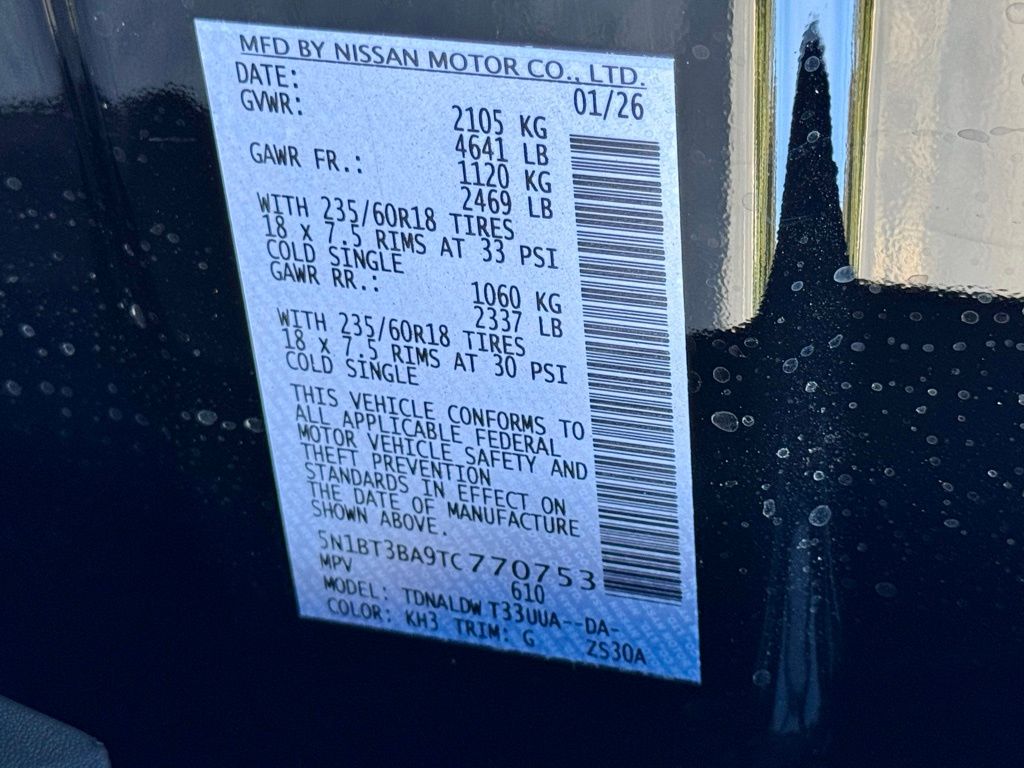 4-Wheel Disc Brakes, 6 Speakers, ABS brakes, Air Conditioning, Alloy wheels, AM/FM radio, Apple CarPlay/Android Auto, Auto High-beam Headlights, Automatic temperature control, Brake assist, Bumpers: body-color, Chrome Rear Bumper Protector, Cloth Seat Trim with Patterned Inserts, Delay-off headlights, Driver door bin, Driver vanity mirror, Dual front impact airbags, Dual front side impact airbags, Electronic Stability Control, Emergency communication system: NissanConnect Services, Four wheel independent suspension, Front anti-roll bar, Front Bucket Seats, Front Center Armrest, Front dual zone A/C, Front reading lights, Fully automatic headlights, Heated door mirrors, Illuminated entry, Knee airbag, Low tire pressure warning, Occupant sensing airbag, Outside temperature display, Overhead airbag, Overhead console, Panic alarm, Passenger door bin, Passenger vanity mirror, Power door mirrors, Power driver seat, Power Liftgate, Power steering, Power windows, Radio data system, Radio: AM/FM NissanConnect, Rear anti-roll bar, Rear seat center armrest, Rear side impact airbag, Rear window defroster, Rear window wiper, Remote keyless entry, Speed control, Speed-sensing steering, Speed-Sensitive Wipers, Split folding rear seat, Spoiler, Steering wheel mounted audio controls, Tachometer, Telescoping steering wheel, Tilt steering wheel, Traction control, Trip computer, and Variably intermittent wipers. Price includes all rebates: $3500 - Nissan Customer Cash. Exp. 05/04/2026