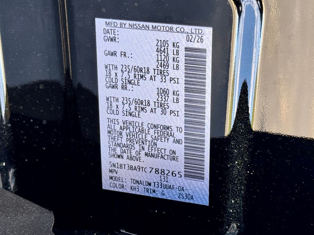 Cold Weather Package (Heated Front Seats and Heated Steering Wheel), 4-Wheel Disc Brakes, 6 Speakers, ABS brakes, Air Conditioning, Alloy wheels, AM/FM radio, Apple CarPlay/Android Auto, Auto High-beam Headlights, Automatic temperature control, Black Splash Guards (set of 4), Brake assist, Bumpers: body-color, Chrome Rear Bumper Protector, Cloth Seat Trim with Patterned Inserts, Delay-off headlights, Driver door bin, Driver vanity mirror, Dual front impact airbags, Dual front side impact airbags, Electronic Stability Control, Emergency communication system: NissanConnect Services, First Aid Kit, Floor Mats with 1-Piece Cargo Area Protector, Four wheel independent suspension, Front anti-roll bar, Front Bucket Seats, Front Center Armrest, Front dual zone A/C, Front reading lights, Fully automatic headlights, Heated door mirrors, Illuminated entry, Knee airbag, Low tire pressure warning, Occupant sensing airbag, Outside temperature display, Overhead airbag, Overhead console, Panic alarm, Passenger door bin, Passenger vanity mirror, Power door mirrors, Power driver seat, Power Liftgate, Power steering, Power windows, Radio data system, Radio: AM/FM NissanConnect, Rear anti-roll bar, Rear seat center armrest, Rear side impact airbag, Rear window defroster, Rear window wiper, Remote keyless entry, Speed control, Speed-sensing steering, Speed-Sensitive Wipers, Split folding rear seat, Spoiler, Steering wheel mounted audio controls, Tachometer, Telescoping steering wheel, Tilt steering wheel, Traction control, Trip computer, USB Charging Cable Set, and Variably intermittent wipers. Price includes all rebates: $3500 - Nissan Customer Cash. Exp. 05/04/2026